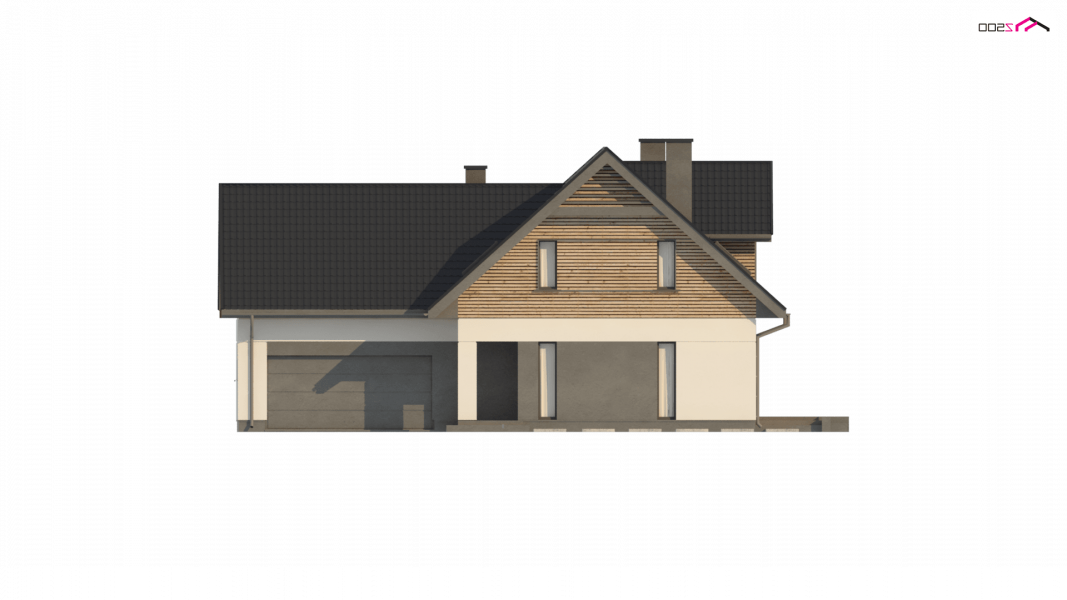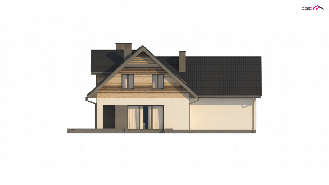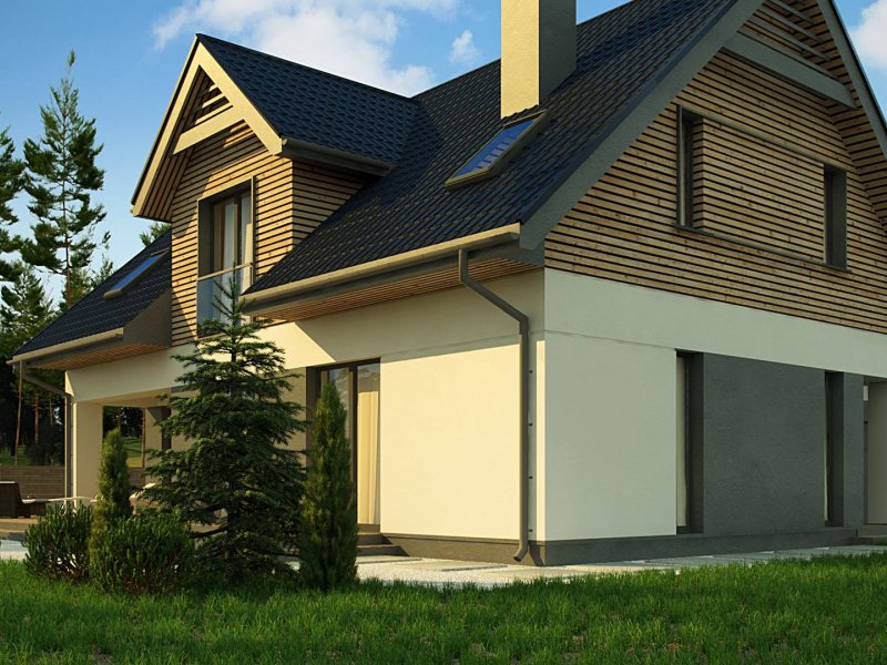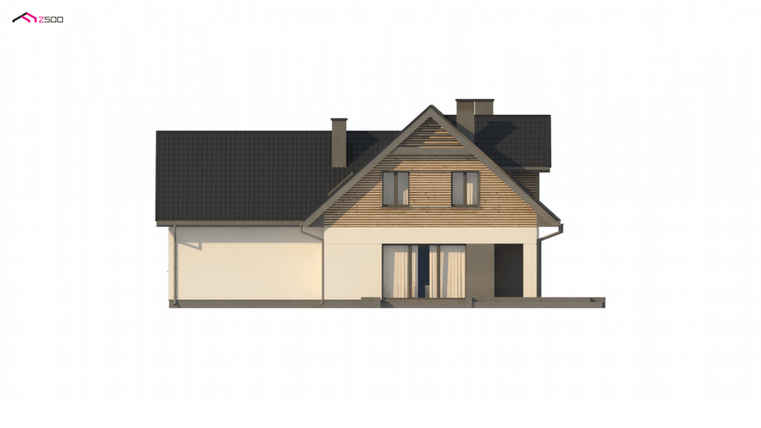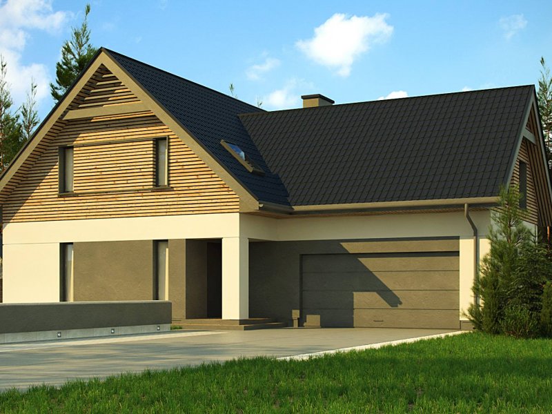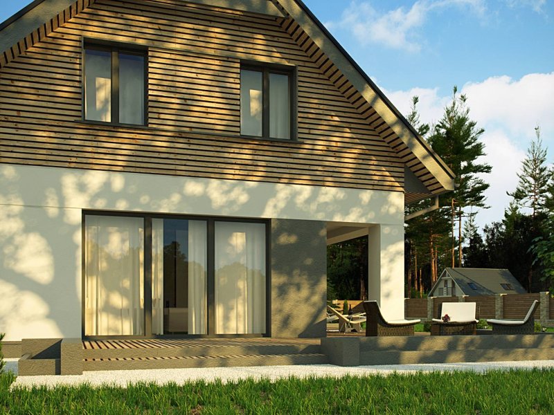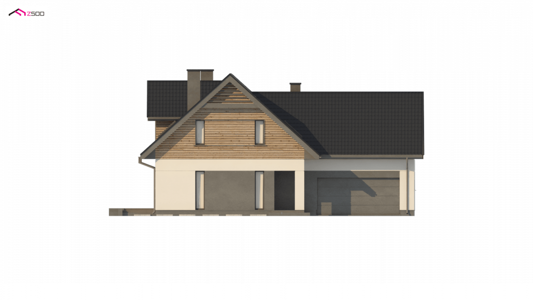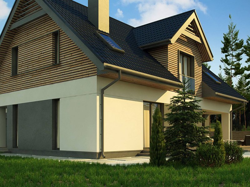 Z359 jest propozycją pięknego domu o tradycyjnej formie, współczesnej stylistycznie, dzięki czemu lekko wpisuje się w polski styl zabudowy. Posiada stromy dach wielospadowy i dwustanowiskowy garaż. Ciekawa forma wykończeniowa elewacji to okładzina drewniana naturalna, bądź tynk imitujący drewno połączona z biało-szarym tynkiem wzbogaconym o boniowania. Całość nadaje budynkowi wrażenia uroku i przytulności.
