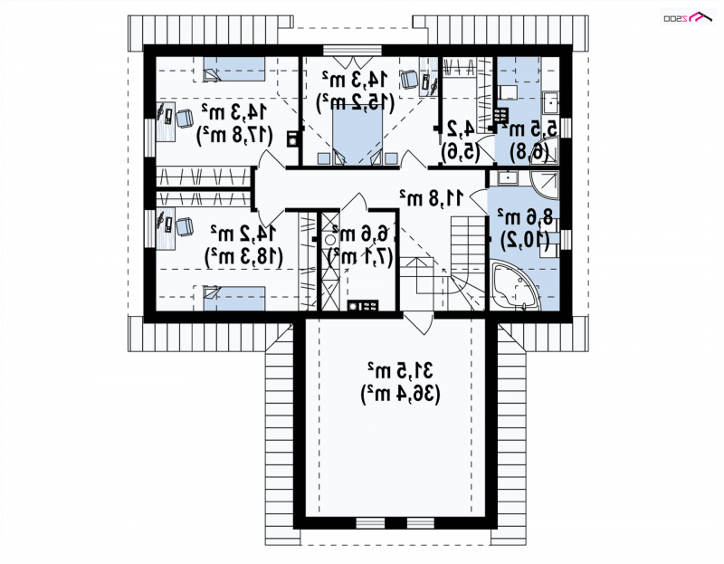 Jedna z sypialni posiada oddzielną łazienkę i garderobę. Pozostałe dwa pokoje mogą służyć za pokoje dla dzieci, natomiast największe pomieszczenie, które na rzucie zostało oznakowane jako „strych”, śmiało może stać się pokojem do swobodnej aranżacji.