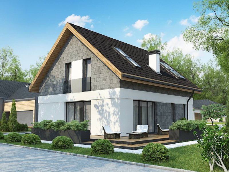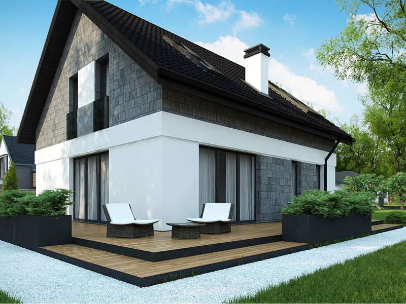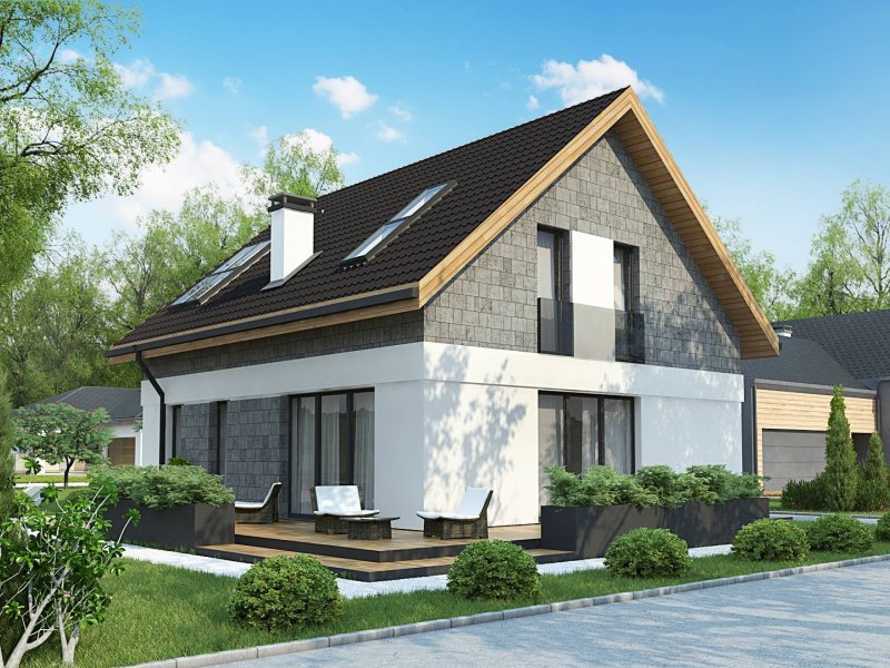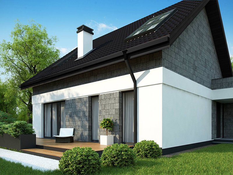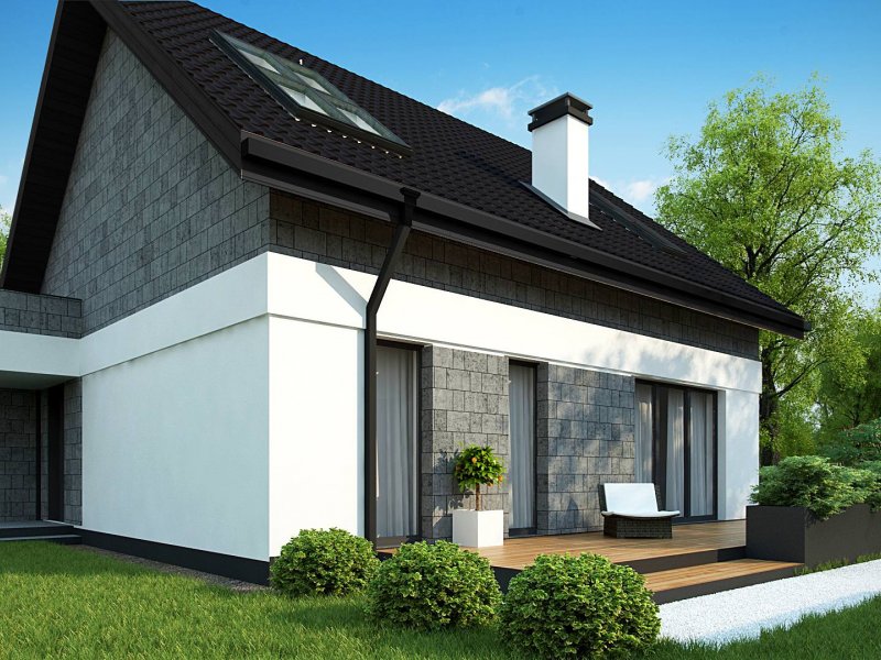 Na wykończenie elewacji składa się proste połączenie jasnego tynku z szarością. Duże, portfenetrowe okna na poddaszu użytkowym rozmieszczono w ten sposób, aby jak najbardziej doświetlały wnętrza, nadając im ciepła i słonecznego blasku.