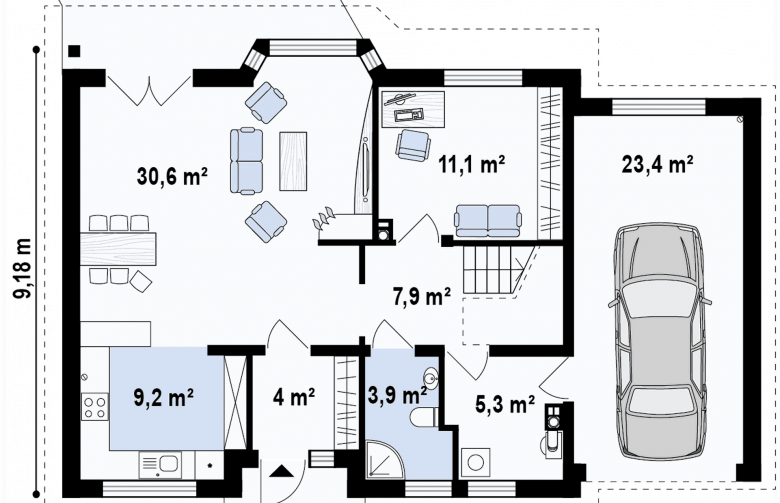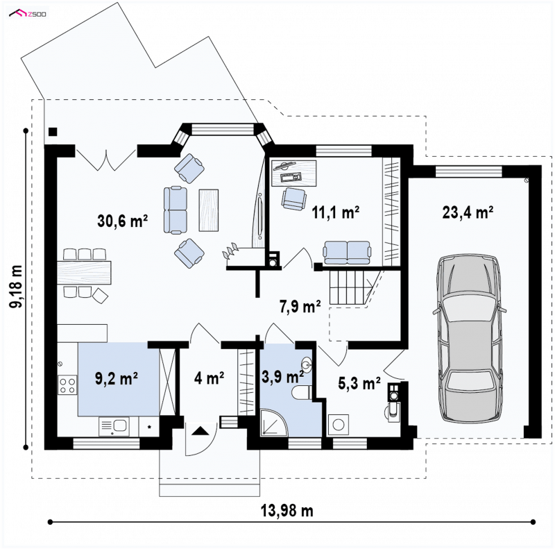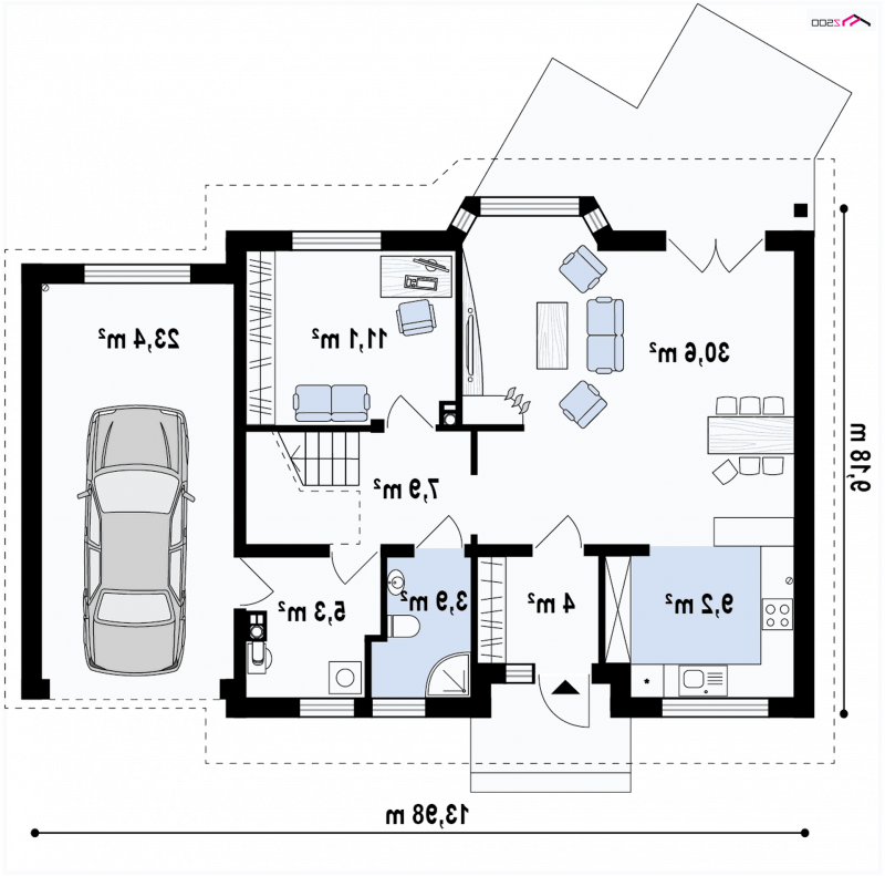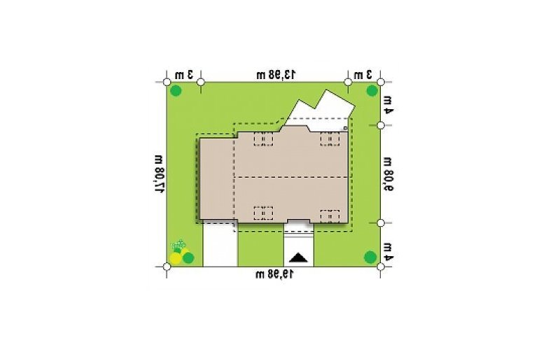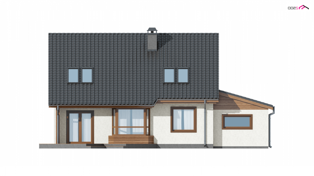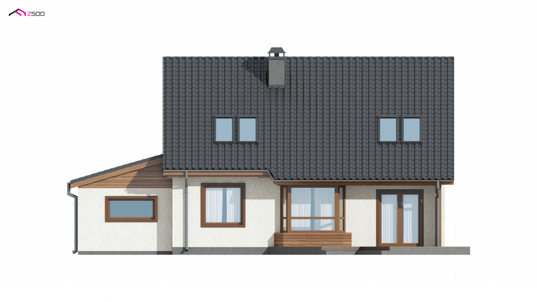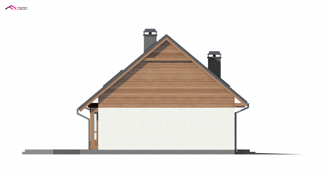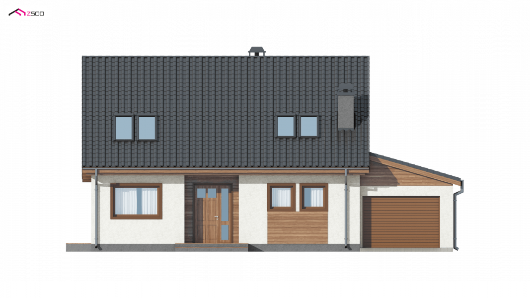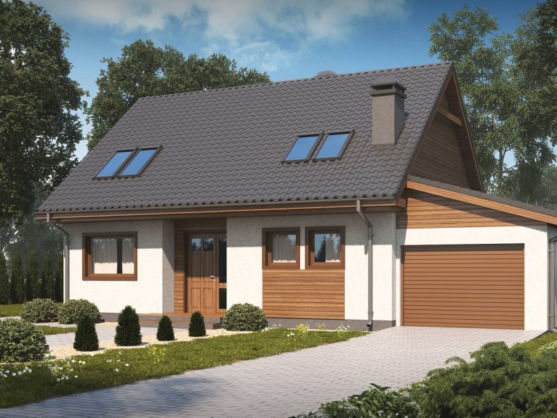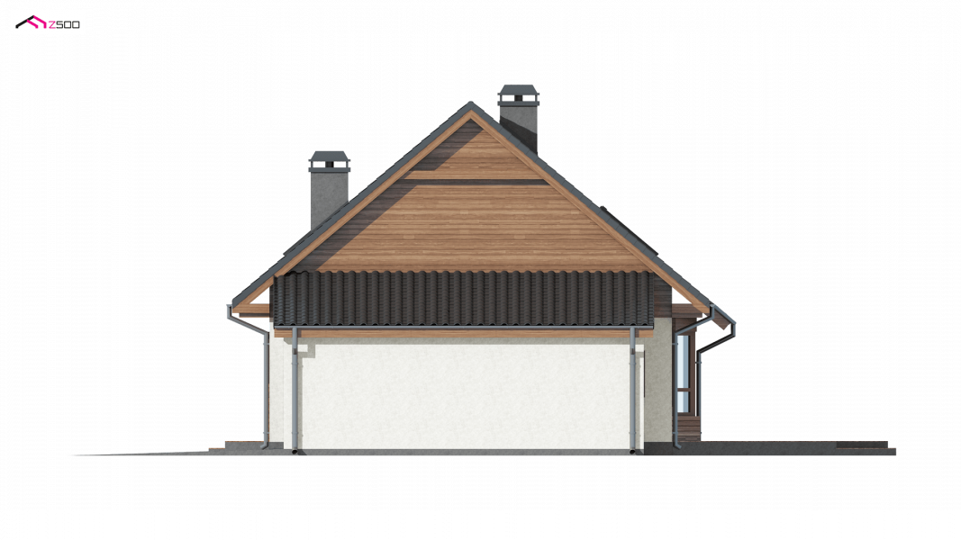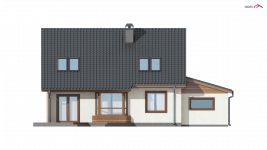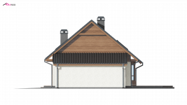Projekt w wersji z garażem po prawej stronie. Zadaszenie garażu w formie dachu pulpitowego.