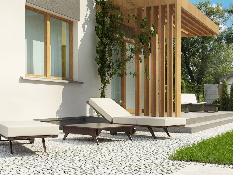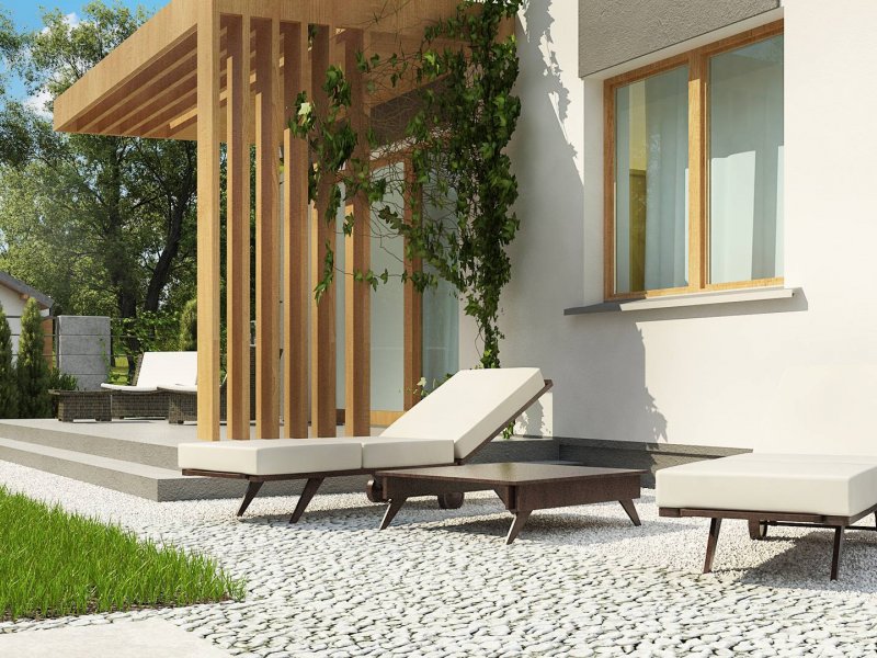 Dzienna strefa mieszkalna posiada wyjście na okalający dom z kilku stron taras, gdzie ustawimy wygodne meble ogrodowe aby móc złapać chwilę wytchnienia i nacieszyć się „własnym kawałkiem zieleni”. Rozłożenie salonu przemyślano w ten sposób, aby część jadalna znajdowała się wygodnie - blisko kuchni, natomiast część wypoczynkowa z plazmą na ścianie i skórą dzika u podnóża kominka bliżej wyjścia na taras. Dzięki temu możemy cieszyć się ciepłem domowego ogniska i świeżością wieczornego powietrza jednocześnie.