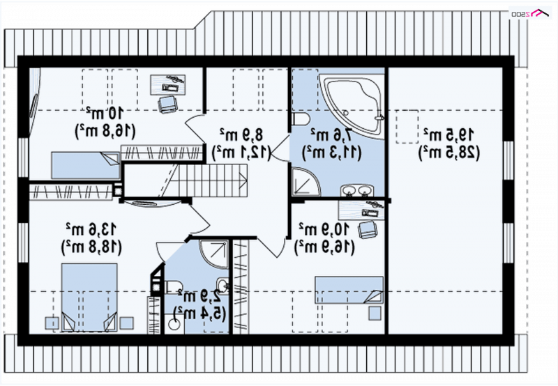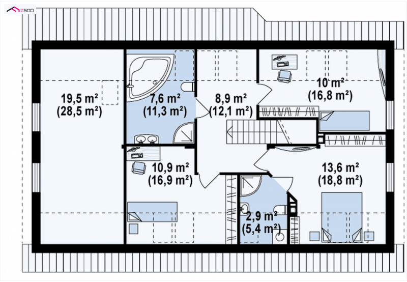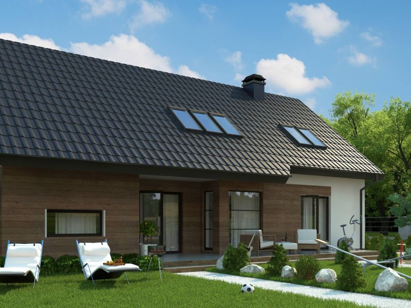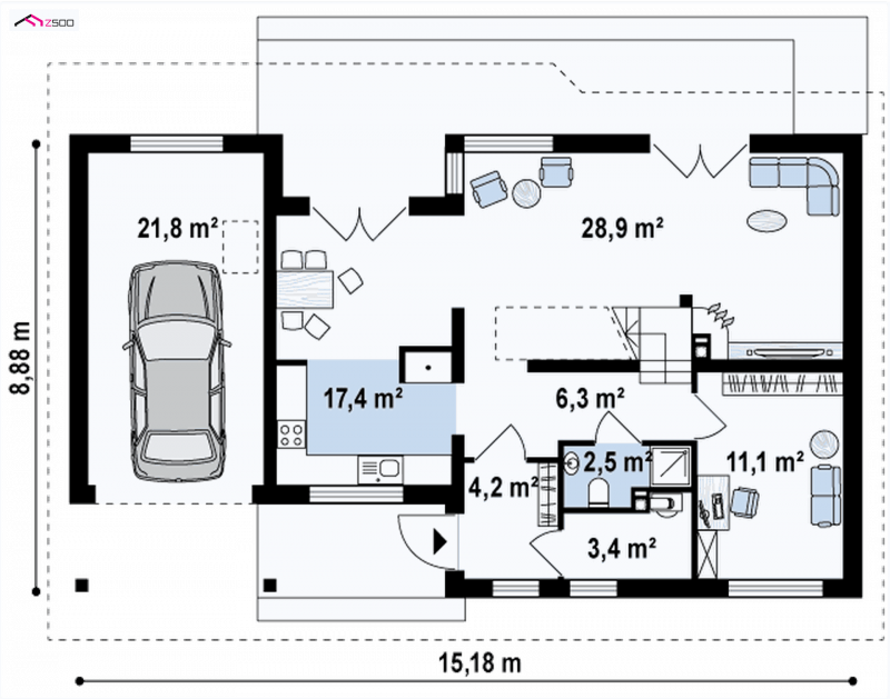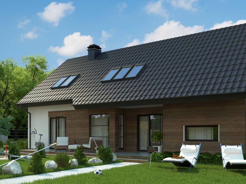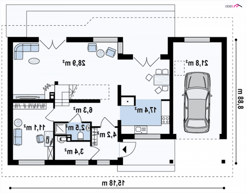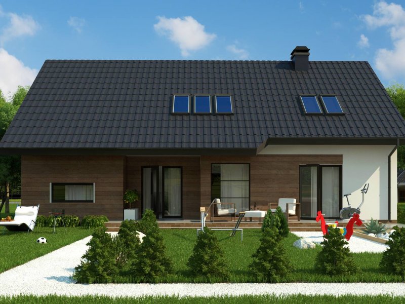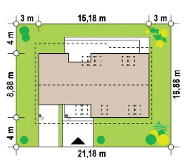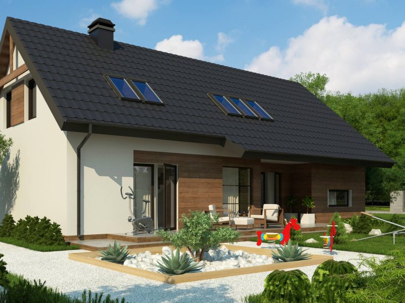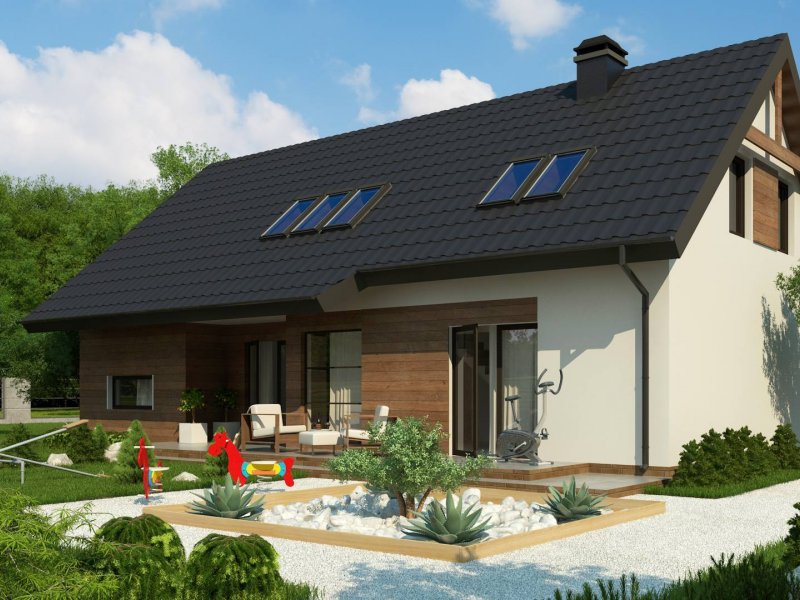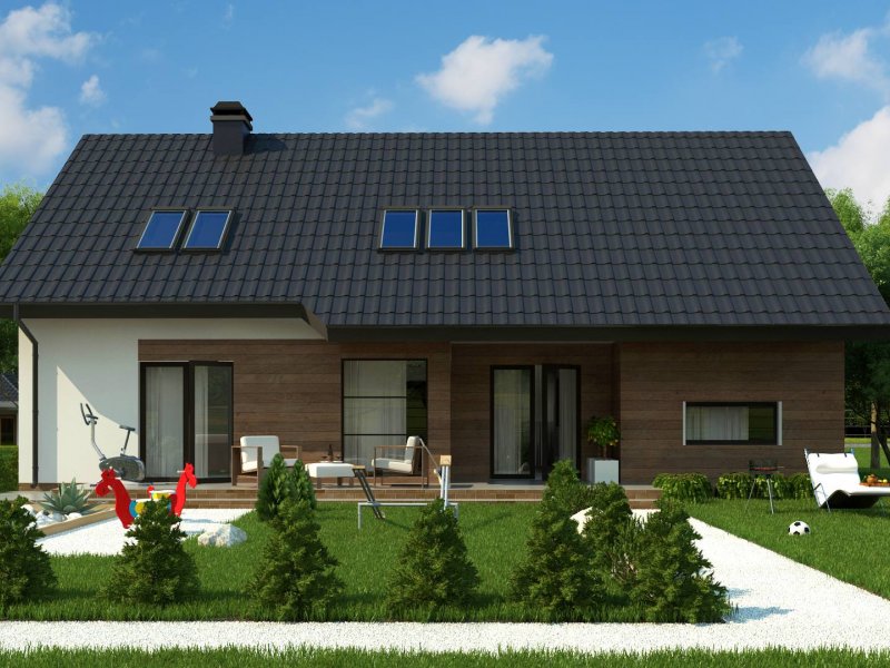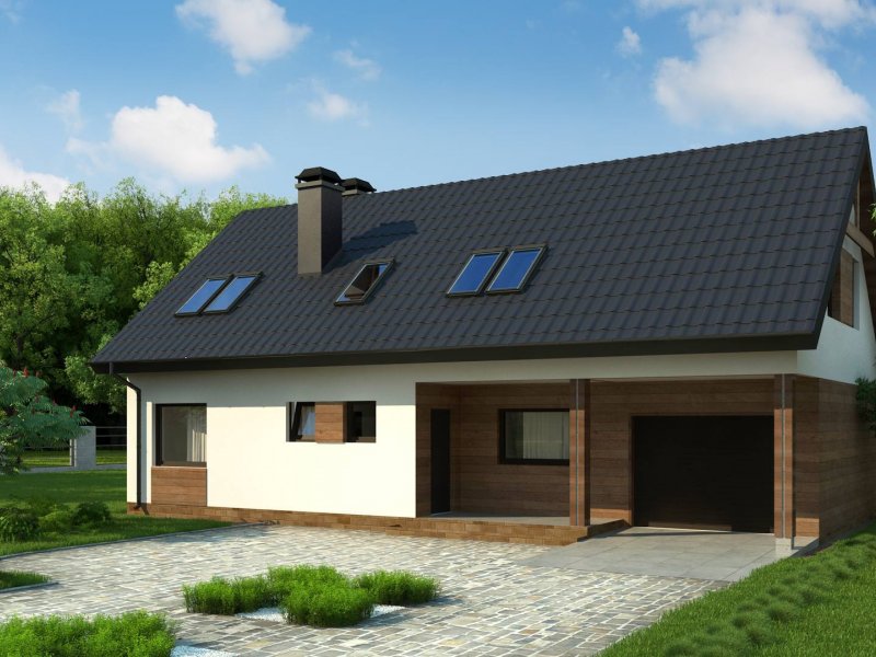 Projekt w wersji z garażem po lewej stronie budynku. Nad garażem przewidziano opcję poddasza użytkowego, co powiększy powierzchnię użytkową.