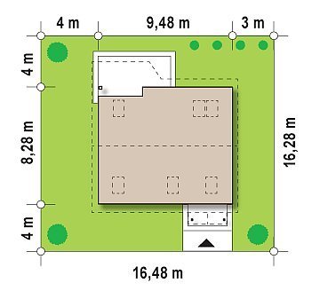 Na parter wchodzimy poprzez zadaszone wejście, prosto do sieni, skąd dalej wchodzimy do holu. Stanowi on ciąg komunikacyjny pomiędzy poszczególnymi pomieszczeniami. Na parterze znajduje się kuchnia połączona z salonem, pokój z garderobą oraz łazienka i pomieszczenie gospodarcze. Z salonu mamy wyjście na zadaszony taras, który może być miłym miejscem na spędzenie wieczoru. Przeszklone duże drzwi zapewnią widok na ogród, a tym samym jedność z otoczeniem zewnętrznym.Na poddaszu znajdują się trzy sypialnie, oraz łazienka. Przy jednej sypialni znajduje się garderoba.