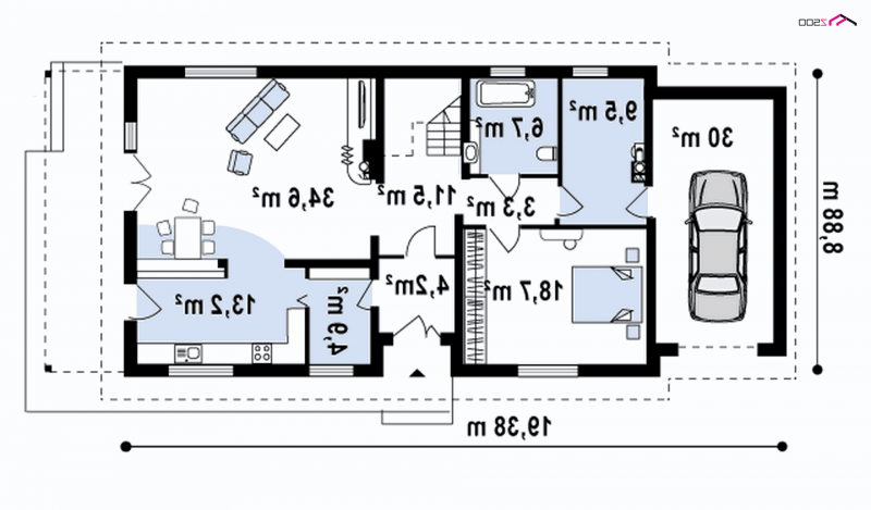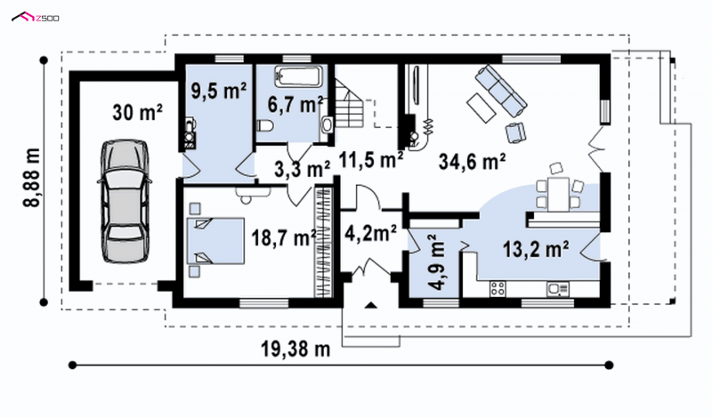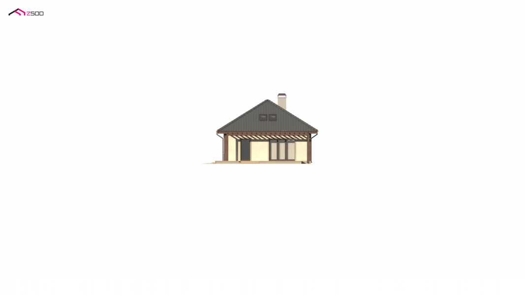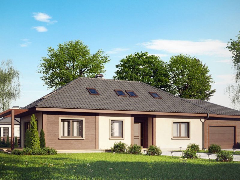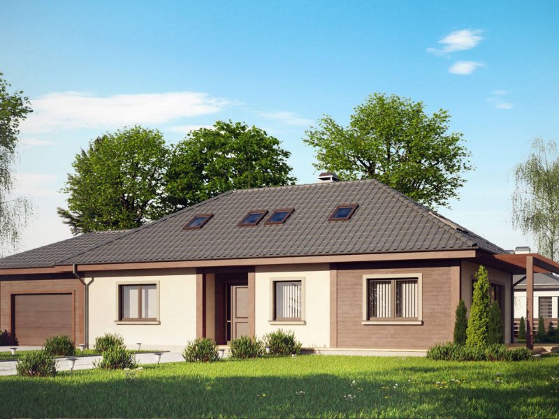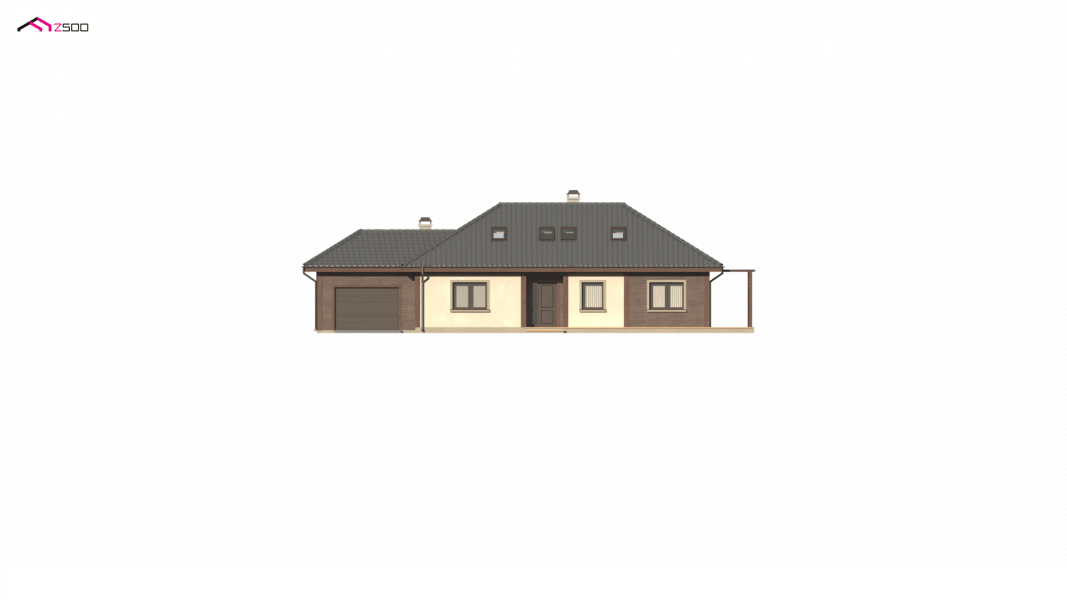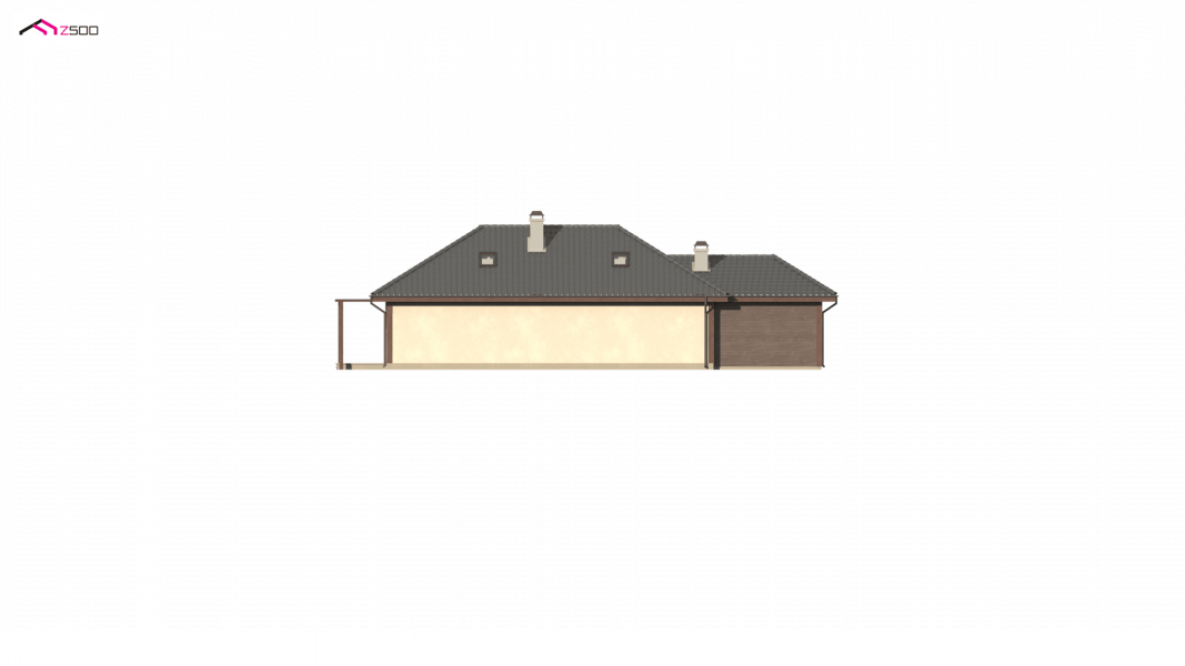 Wersja z powiększonym garażem. Szerokość garażu w osiach powiększono z 360cm do 450cm.
