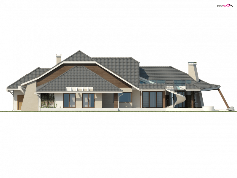 Tutaj architekturą jest oryginalna bryła i niesamowicie proporcjonalny, płynący dach, z wieloma liniami falistymi, dającymi wrażenie lekkości i zwinności domowi. Do tego duże okna tarasowe do samej ziemi, elementy drewna, oraz podpora dachu w miejscu otwarcia wnętrza na ogród, dopełniają całkowicie styl tej robiącej wrażenie rezydencji. Ażurowe fragmenty dachu pozwalają wpłynąć większej ilości światła dziennego do wewnątrz! Wszystkie dodatki są dobrane przez architekta z idealną precyzją.