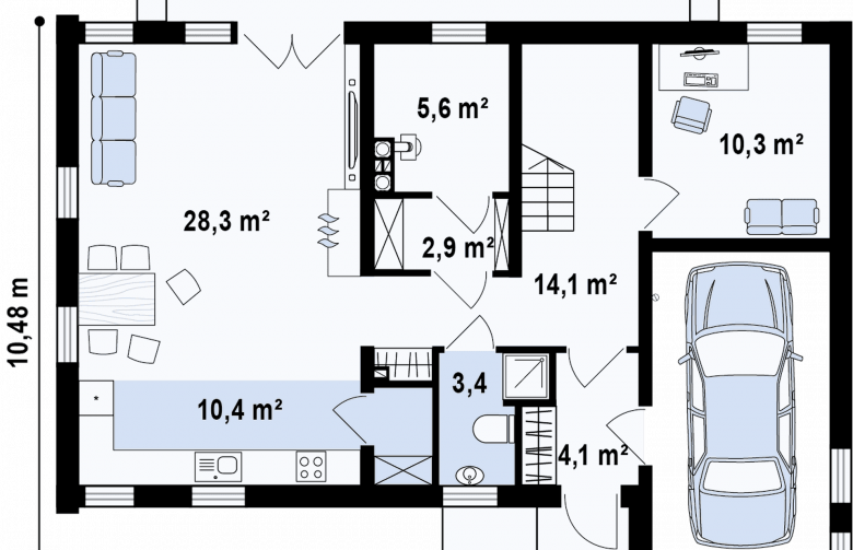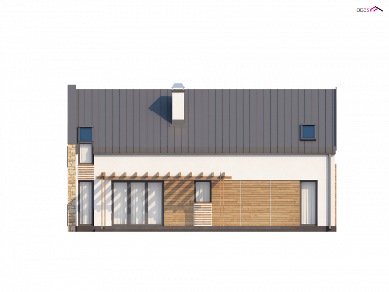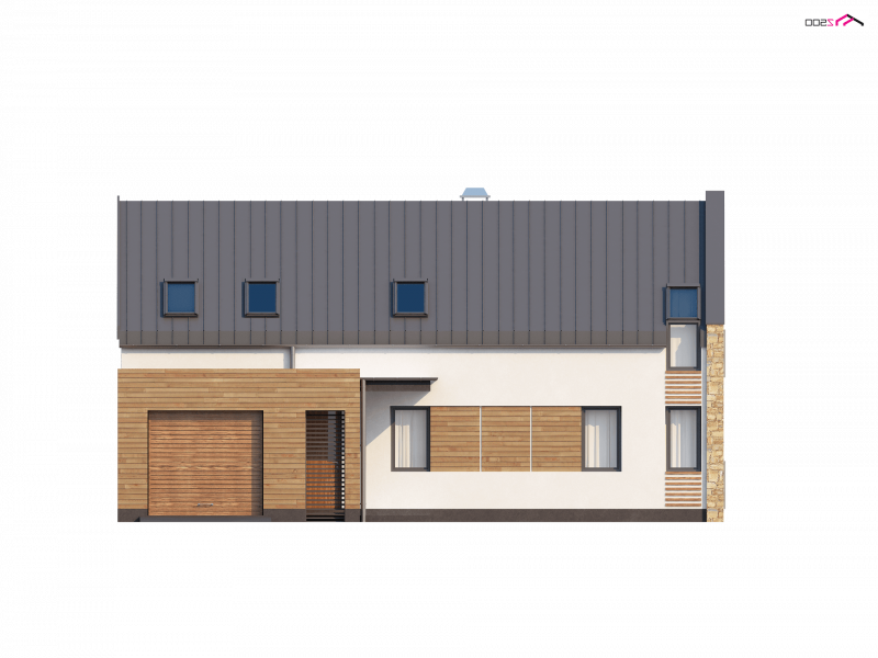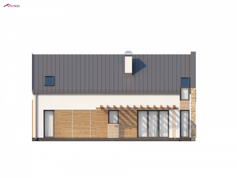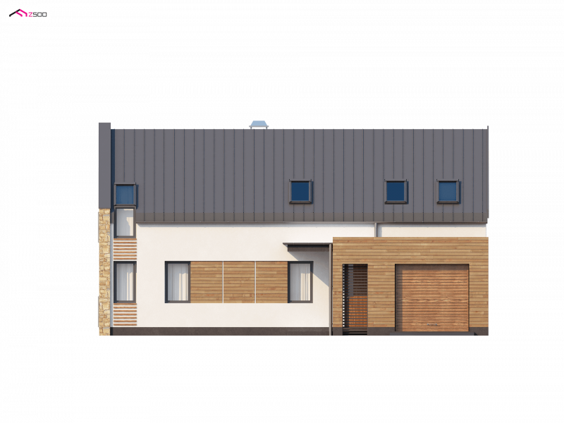 Zx38 to dom o zgrabnej formie. Ciekawe zestawienie różnych materiałów na elewacjach oraz rezygnacja z tradycyjnej formy dachu z okapem podkreślają nowoczesny charakter tego projektu. Wysunięty przed bryłę domu garaż z ciekawą formą zadaszenia tworzą atrakcyjną strefę wejściową.
