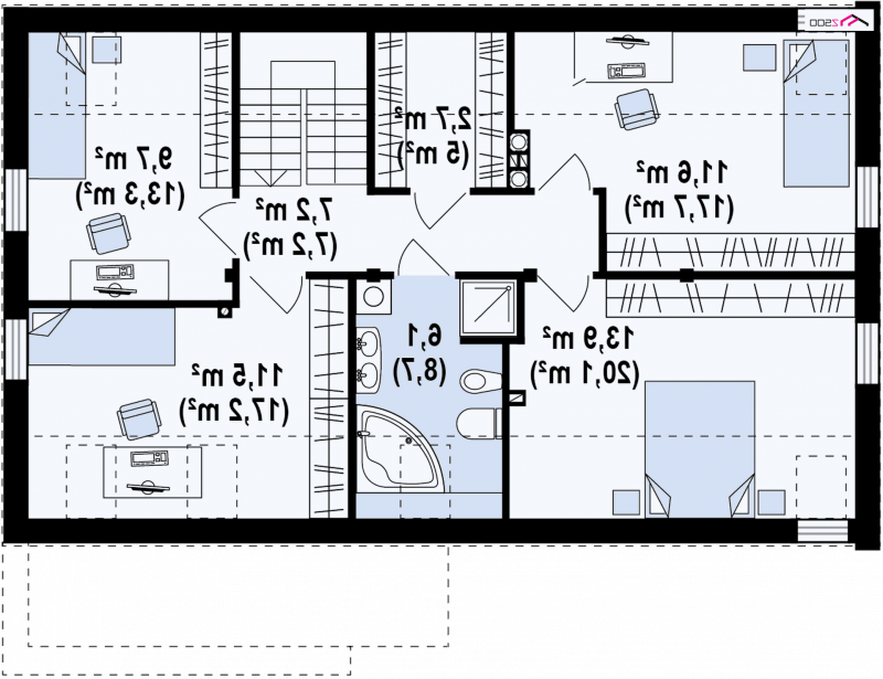 Część dzienna na parterze skupiona jest wokół centralnie umieszczonego kominka. Tworzą ją: salon z jadalnią oraz otwarta kuchnia z długim blatem roboczym oraz spiżarnią. Z holu dostępna jest łazienka z prysznicem, obszerne pomieszczenie gospodarcze oraz dodatkowy pokój. Może on, w zależności od potrzeb, pełnić funkcję sypialni, gabinetu lub pokoju dla gości. Program parteru uzupełnia jednostanowiskowy garaż dostępny z sieni. Na poddaszu mieszczą się 4 wygodne sypialnie oraz duża łazienka i garderoba. W dwóch sypialniach zaprojektowano nowoczesne okna dachowe z pionowym naświetlem.