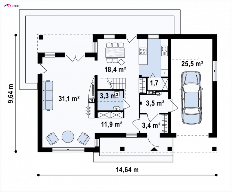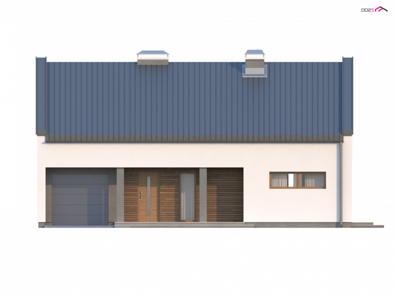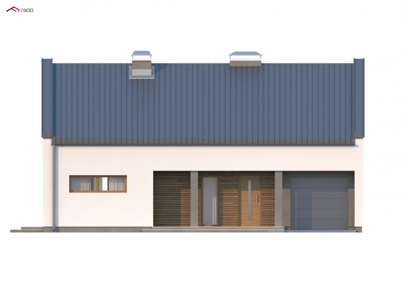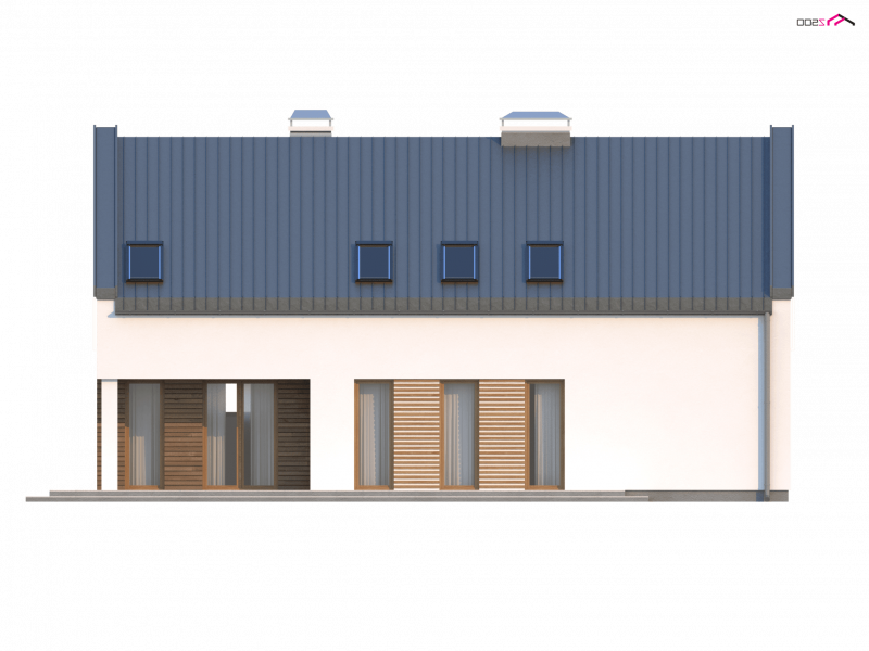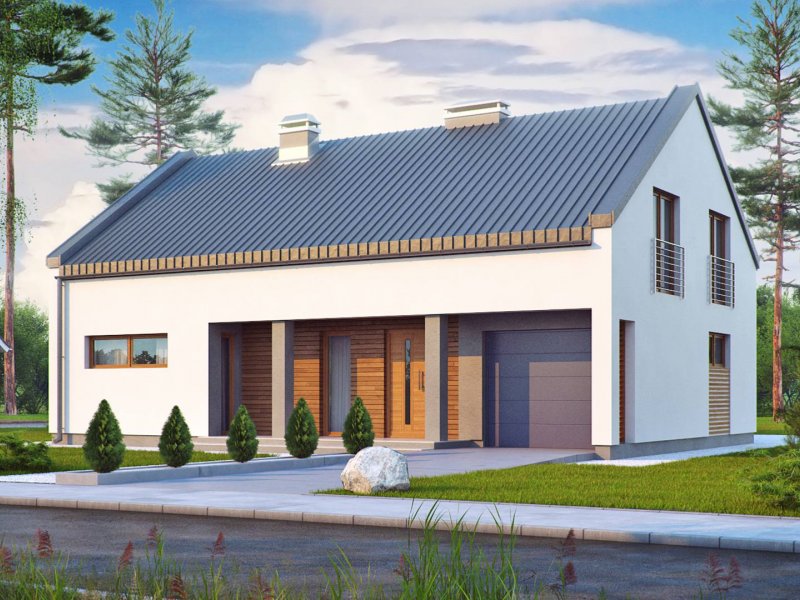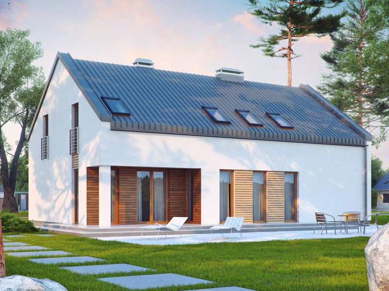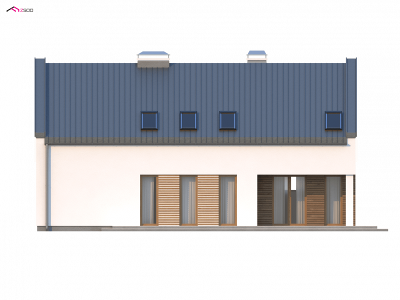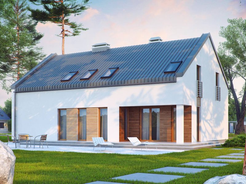 Zx43 to nowoczesny dom z poddaszem użytkowym dla 4,5-osobowej rodziny. Główną zaletą projektu jest zlokalizowana na parterze obszerna strefa dzienna otwarta na ogród.