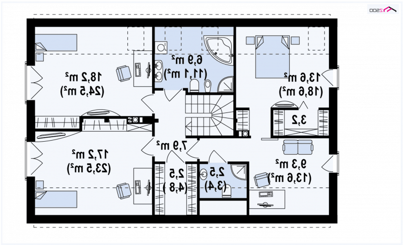 Na poddaszu zaprojektowano część nocną. Są tu 2 obszerne bliźniacze sypialnie, duża łazienka, ogólnodostępna garderoba. W lewej części wydzielono intymną strefę gospodarzy - sypialnię z osobną garderobą i łazienką oraz gabinet do pracy.