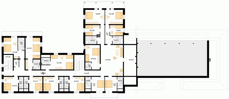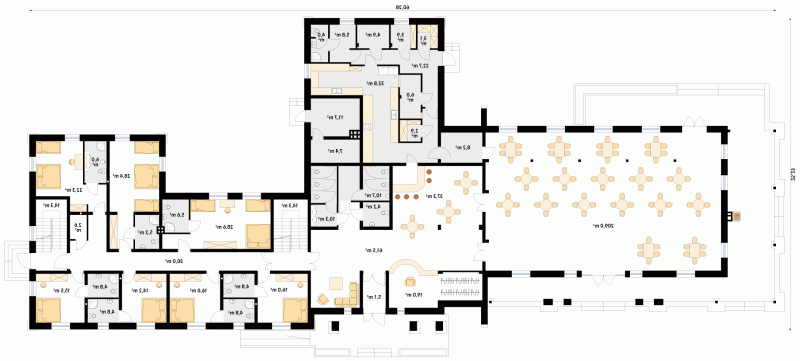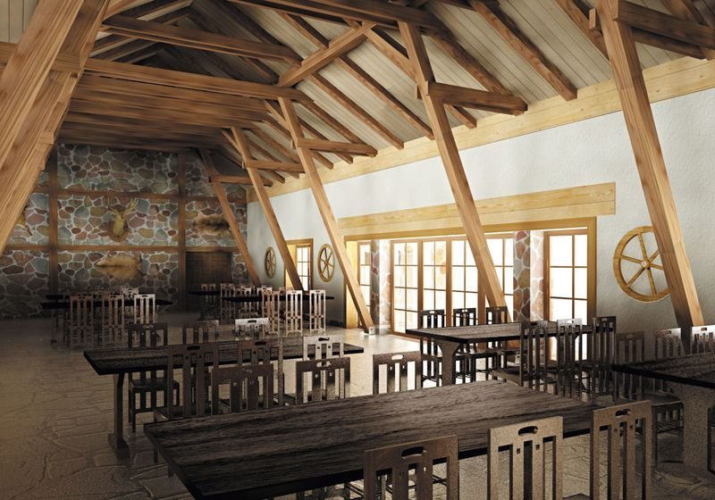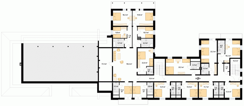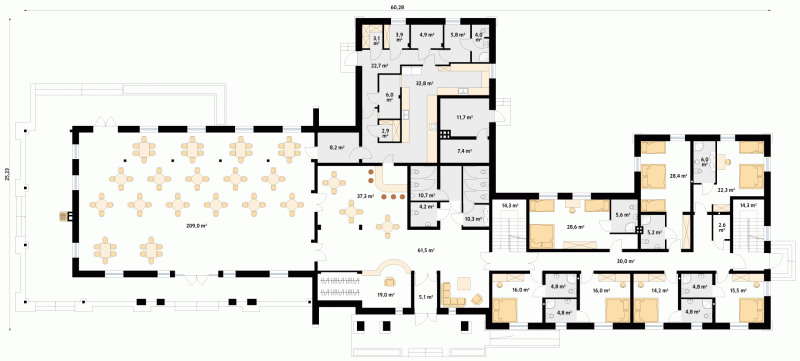 Pensjonat parterowy z poddaszem użytkowym, niepodpiwniczony. Część mieszkalna: 18 pokoi i 2 mieszkania 2-pokojowe do wynajęcia. Pokoje na parterze przeznaczone są dla osób niepełnosprawnych. Część restauracyjno-bankietowa: sala o powierzchni 209 m2 z oddzielnym wejściem, zaplecze kuchenne, bar i restauracja.