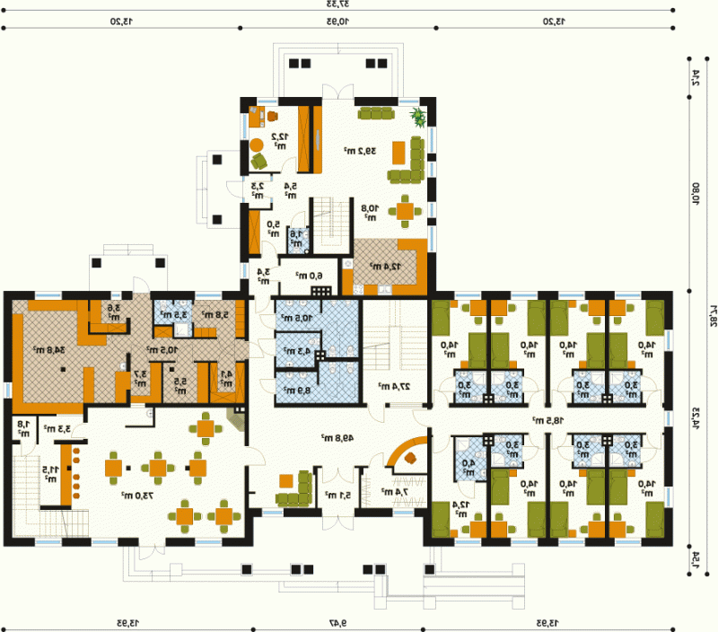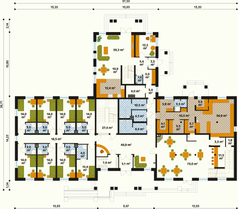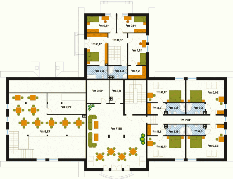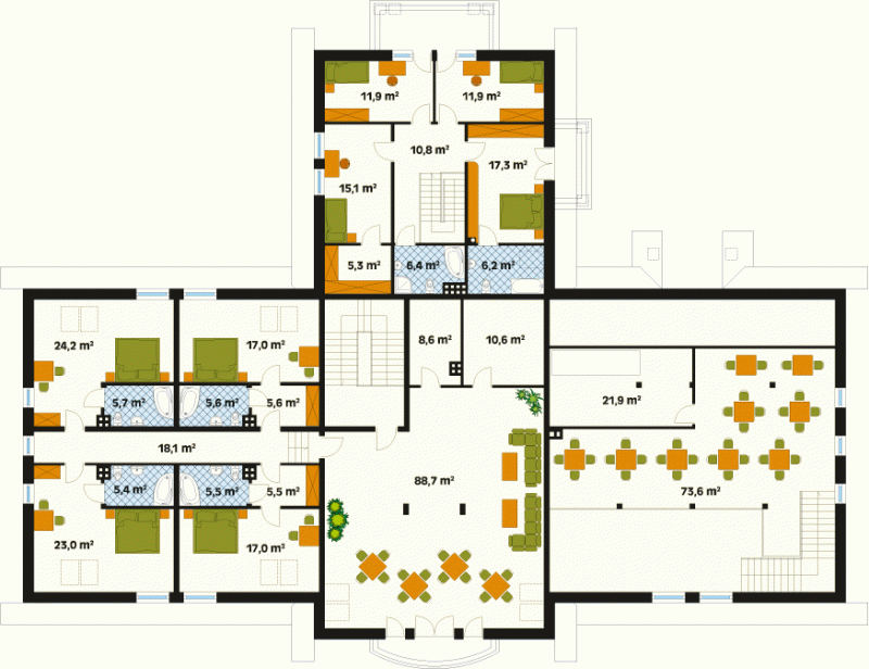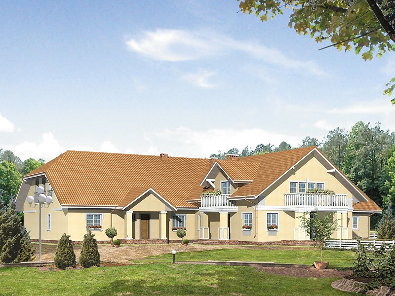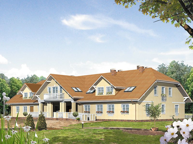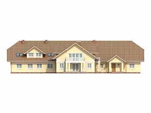 Pensjonat parterowy z poddaszem użytkowym, niepodpiwniczony. Reprezentacyjna bryła z ozdobnym frontem. Klarowny układ funkcjonalny z wyraźnym podziałem na część pensjonatową i mieszkanie z oddzielnym wejściem. Na parterze zaprojektowano osiem pokoi 2-osobowych do wynajęcia, przestronny hol, część gastronomiczną z antresolą. Na poddaszu mieszczą się cztery pokoje 2-osobowe, duży pokój dzienny dla wynajmujących.