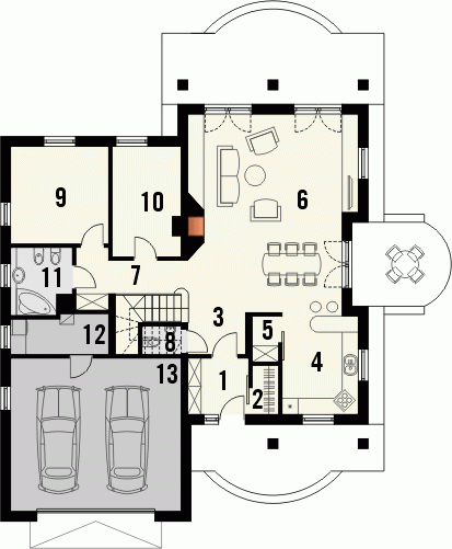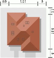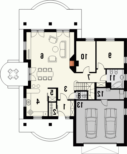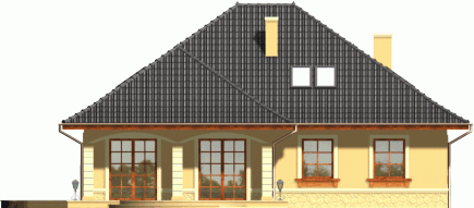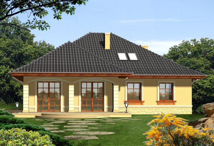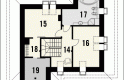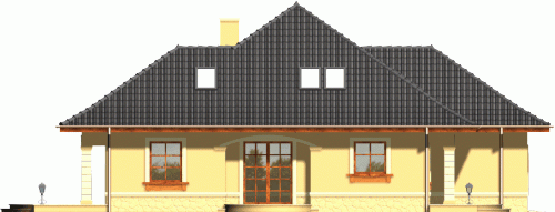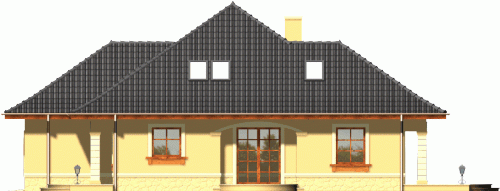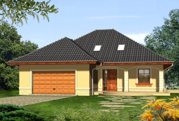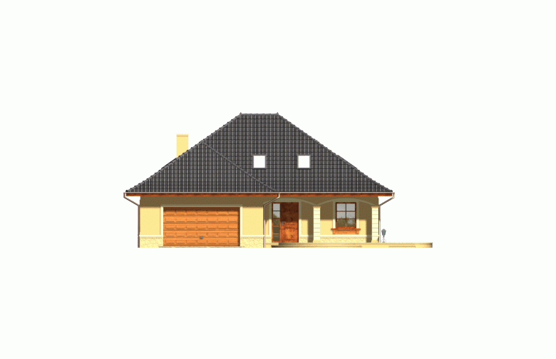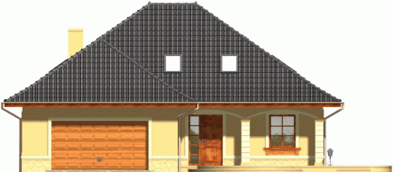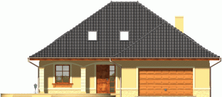 Budynek niepodpiwniczony piętrowy z garażem dwustanowiskowym. Na parterze wydzielono strefę dzienną z salonem, wc i kuchnią ze spiżarką oraz strefę nocną z dwoma pokojami i łazienką. Na poddaszu znajdują się dwa dodatkowe pokoje oraz łazienka, garderoba i strych. Dokumentacja dostępna również w odbiciu lustrzanym.