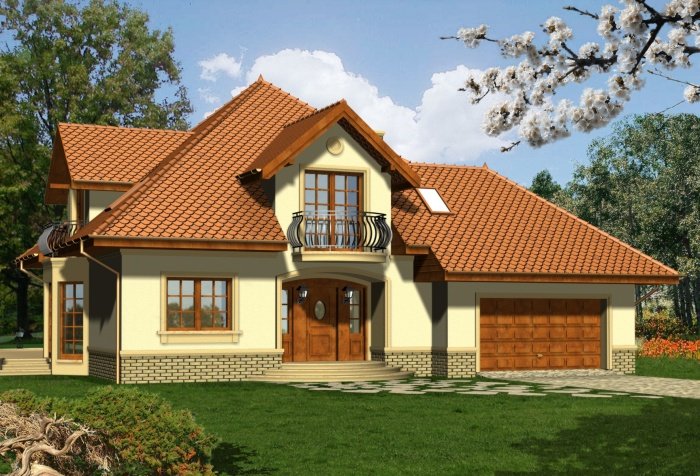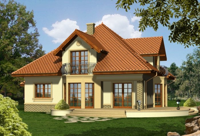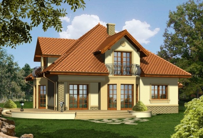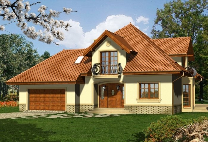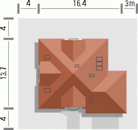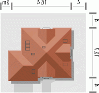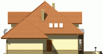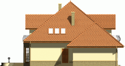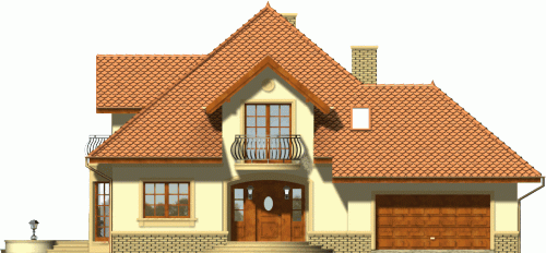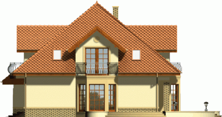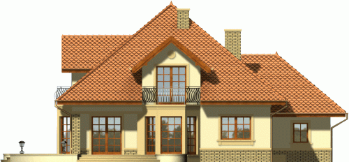 Reprezentacyjny dom przykryty rozłożystym dachem kopertowym. Stonowana kolorystyka fasad w połączeniu z klasycznym ich wystrojem nadają mu szczególnie atrakcyjnego wyglądu. Uwagę zwracają także niebanalne, duże przeszklenia od strony ogrodowej, dzięki którym będzie doskonale doświetlone wnętrze domu.