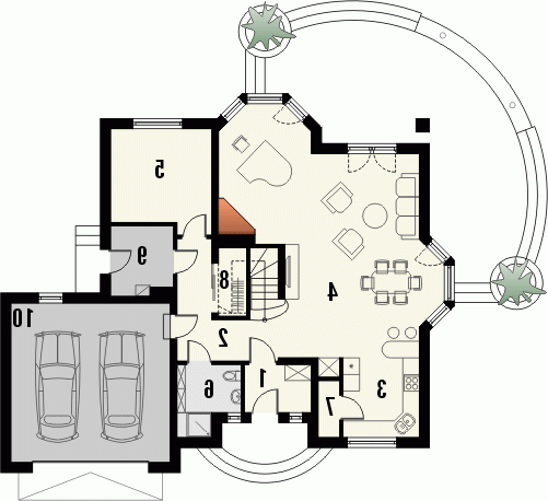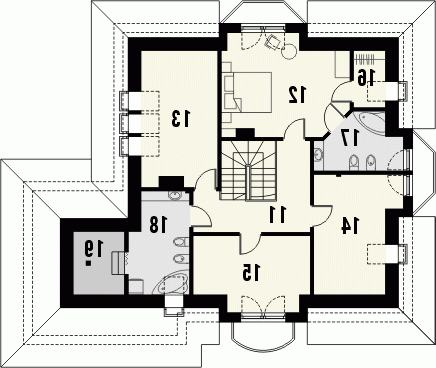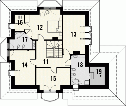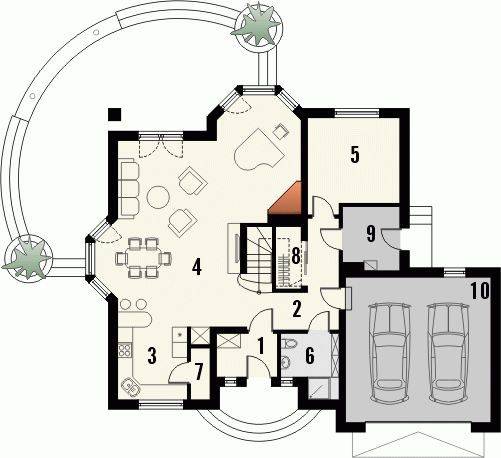 Budynek niepodpiwniczony piętrowy z garażem dwustanowiskowym. Na parterze zaprojektowano pokój dzienny z jadalnią, kuchnię ze spiżarnią, dodatkowy pokój, łazienkę, garaż i pomieszczenie gospodarcze. Zaletą domu jest duży salon z wykuszem, połączony z jadalnią i kuchnią. Na poddaszu znajdują się cztery pokoje i dwie łazienki oraz garderoba. Dokumentacja dostępna również w odbiciu lustrzanym.