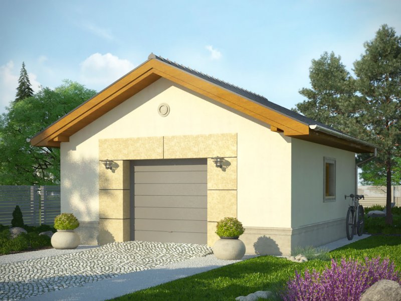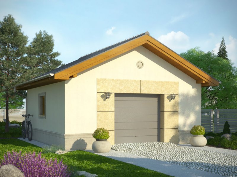 Propozycja garażu z dachem dwuspadowym iuchylną bramą wjazdową. Budynek o klasycznym wystroju z wjazdem w ścianie szczytowej.