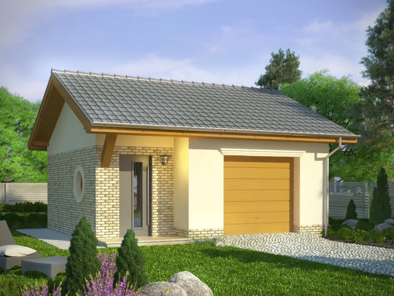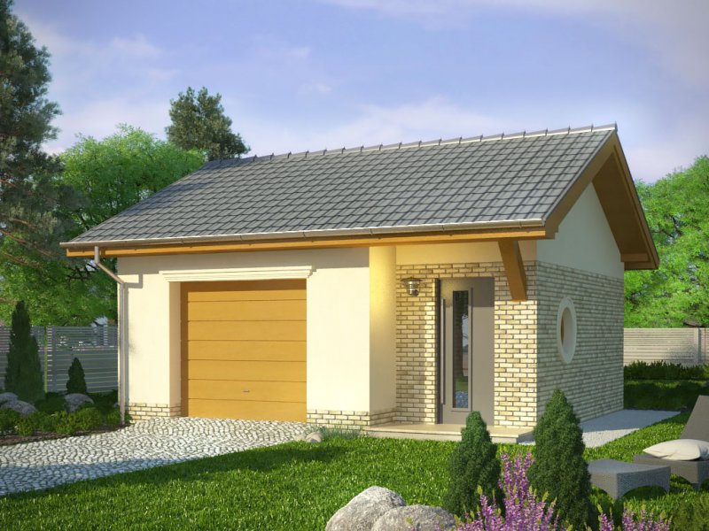 Propozycja garażu z dachem dwuspadowym iuchylną bramą wjazdową. Budynek o nowoczesnym wystroju z wjazdem w ścianiebocznej.