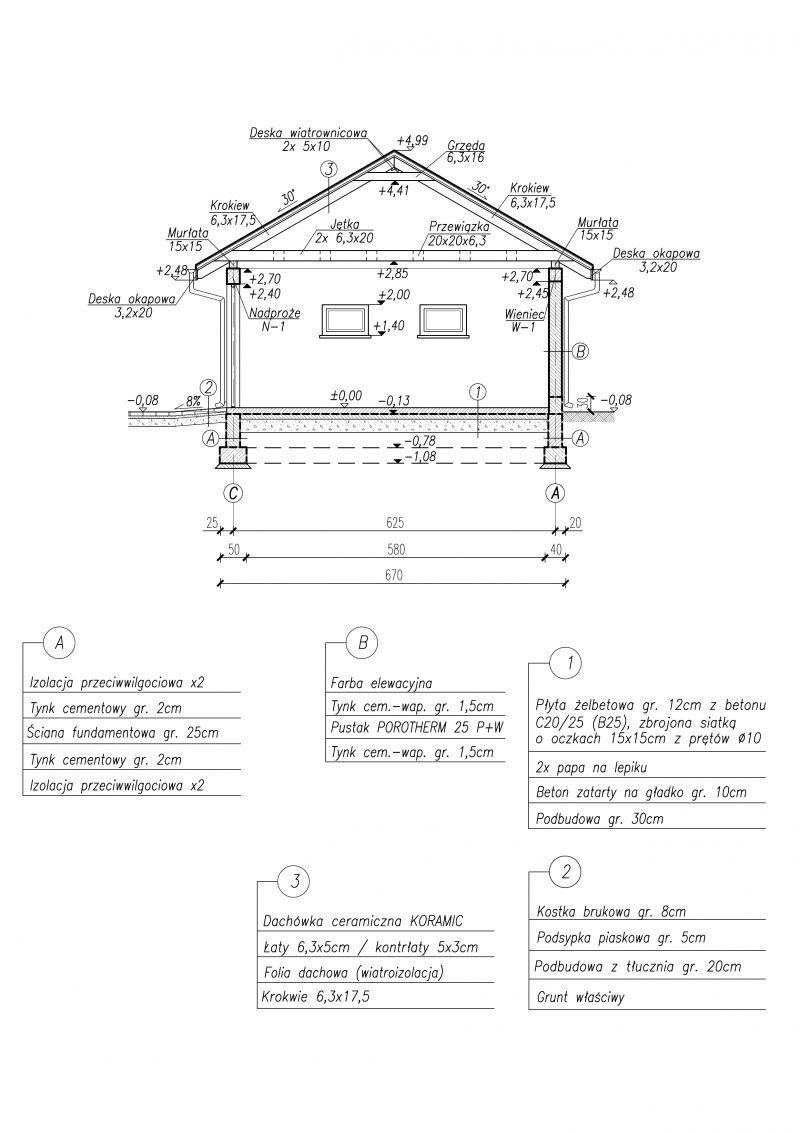 Budynek gospodarczy, wolnostojący. Projekt składa się z części architektonicznej, konstrukcyjnej i wewnętrznej instalacji elektrycznej. W projekcie załączone są podstawowe zestawienie stali, drewna i stolarki okienno-drzwiowej. Do projektu dołączamy bezpłatną zgodę na wprowadzenie zmian, oświadczenie projektantów o wykonaniu projektu zgodnie z obowiązującymi normami i przepisami oraz kserokopie uprawnień projektantów wraz z aktualnym wpisem do izby. W przypadku zamówienia projektu w technologii lekkiej, drewnianej konstrukcji szkieletowej, powierzchnia użytkowa budynku jest o około 7% większa.