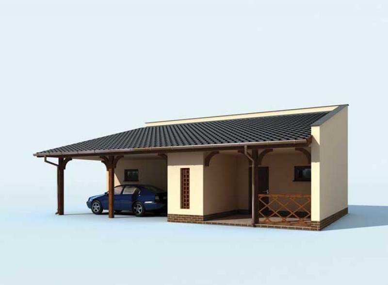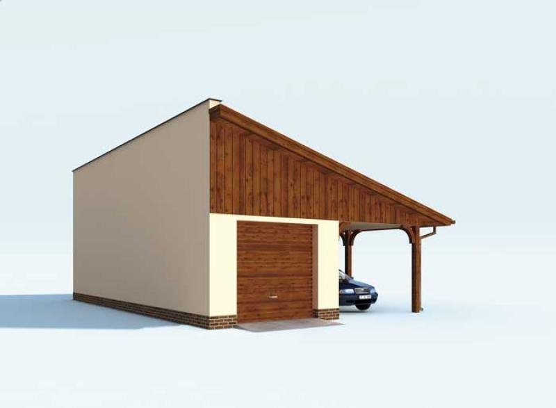 Garaż jednostanowiskowego z wiatą garażową i pomieszczeniem gospodarczym.