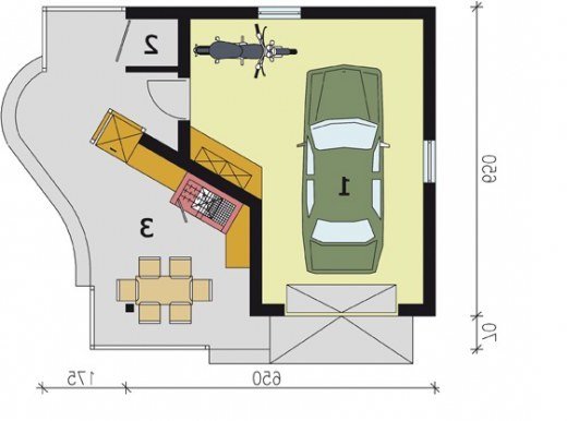Garaż jednostanowiskowy ze składem na drewno kominkowe oraz werandą. Projekt garażu składa się z czterech egzemplarzy a w tym części architektonicznej, konstrukcyjnej i instalacji wewnętrznej elektrycznej. W projekcie załączone są podstawowe zestawienie stali, drewna i stolarki okienno-drzwiowej. Do projektu dołączamy bezpłatną zgodę na wprowadzenie zmian, oświadczenie projektantów o wykonaniu projektu zgodnie z obowiązującymi normami i przepisami oraz kserokopie uprawnień projektantów wraz z aktualnym wpisem do izby.