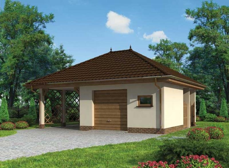 Garaż jednostanowiskowy ze składem na drewno i odpady oraz wiatą.