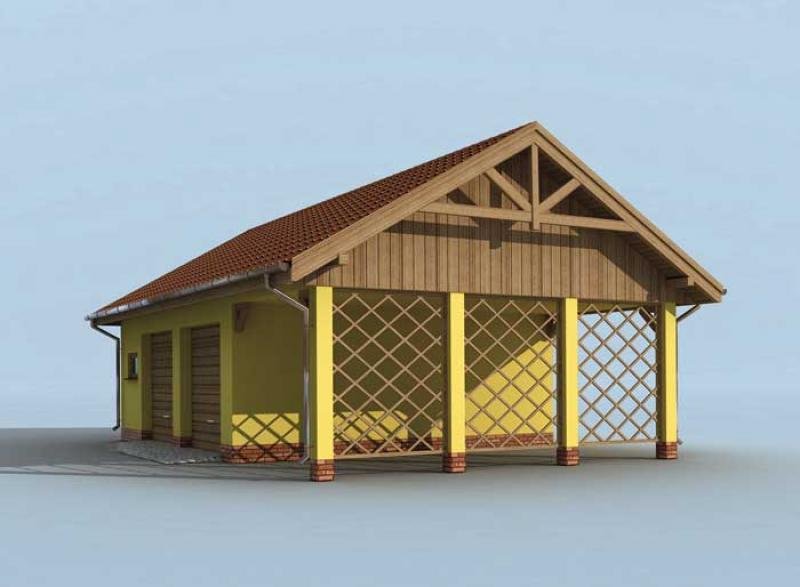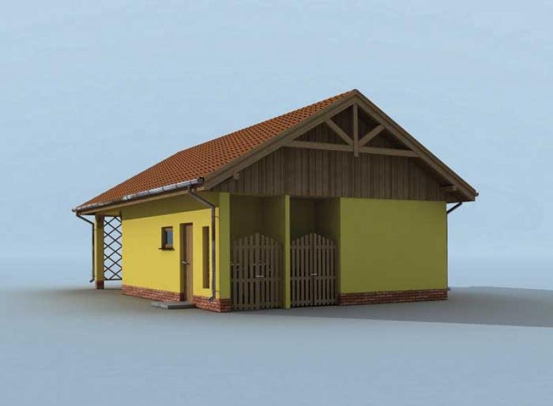 Garaż dwustanowiskowy ze składem na drewno i odpady oraz wiatą.