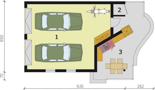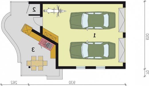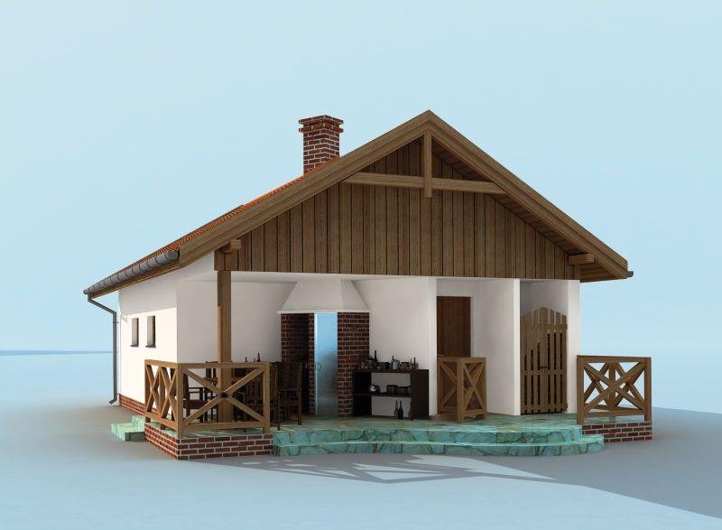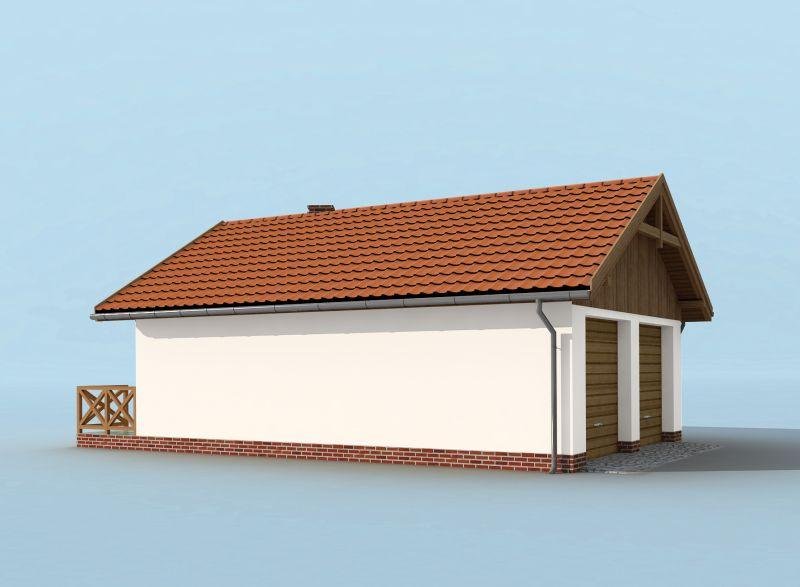 Garaż dwustanowiskowy z składem na drewno i werandą w technologii szkieletowej, wolnostojący, parterowy.