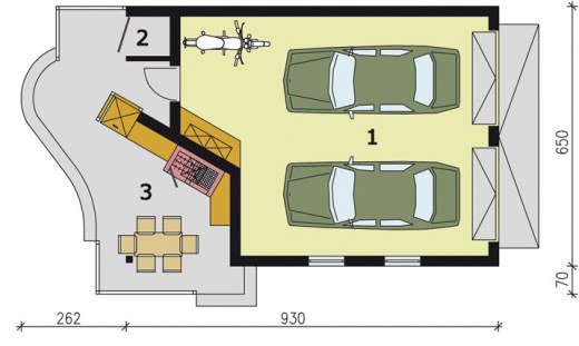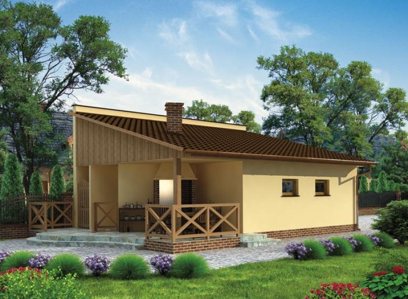 Garaż dwustanowiskowy ze składem na drewno kominkowe, werandą oraz wędzarnikiem.