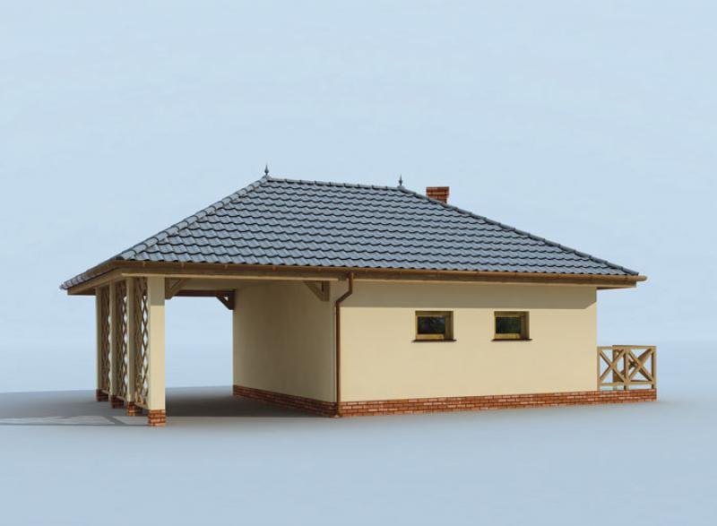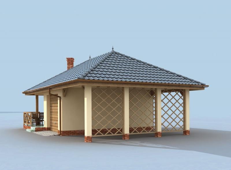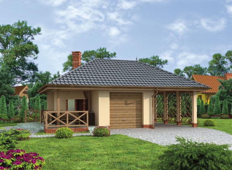 Garaż dwustanowiskowy ze składem na drewno kominkowe, werandą oraz wędzarnikiem.