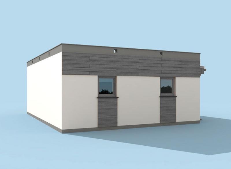 Garaż dwustanowiskowy z pomieszczeniem gospodarczym w technologii szkieletowej, wolnostojący, parterowy.