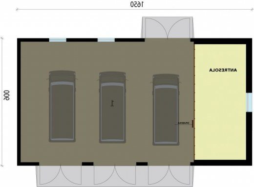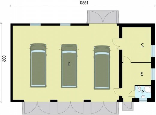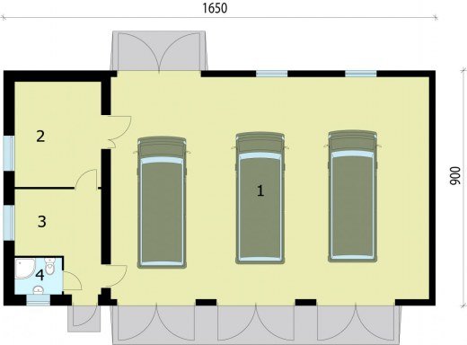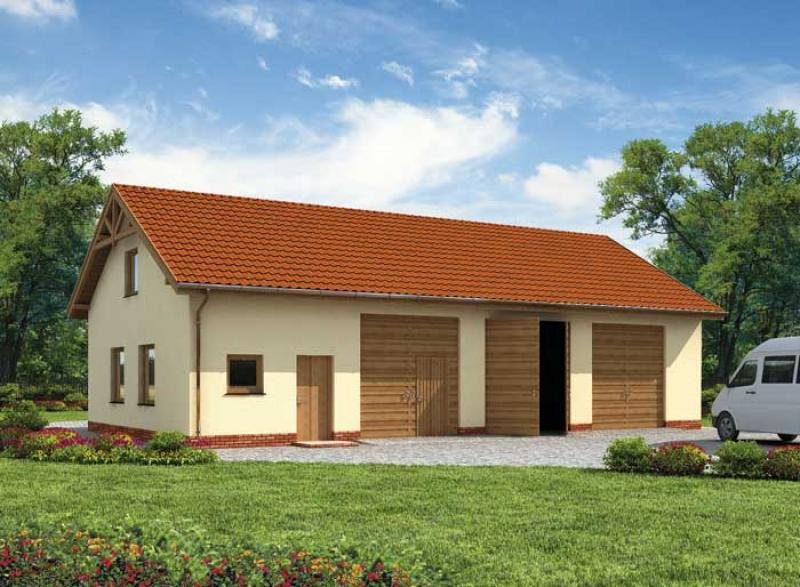 Projekt garażu trzystanowiskowego (3xosobowy/bus) z magazynem oraz pomieszczeniem gospodarczym i łazienką.