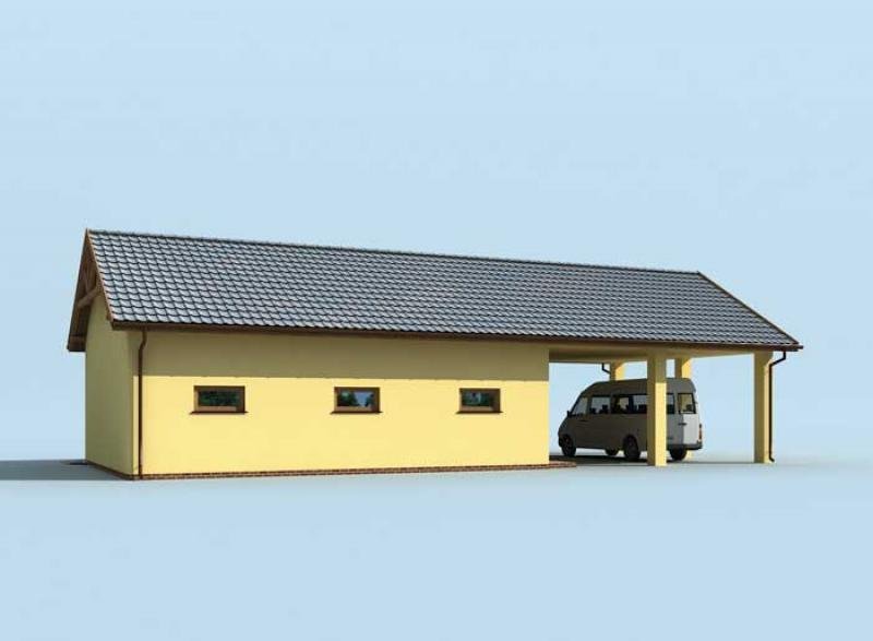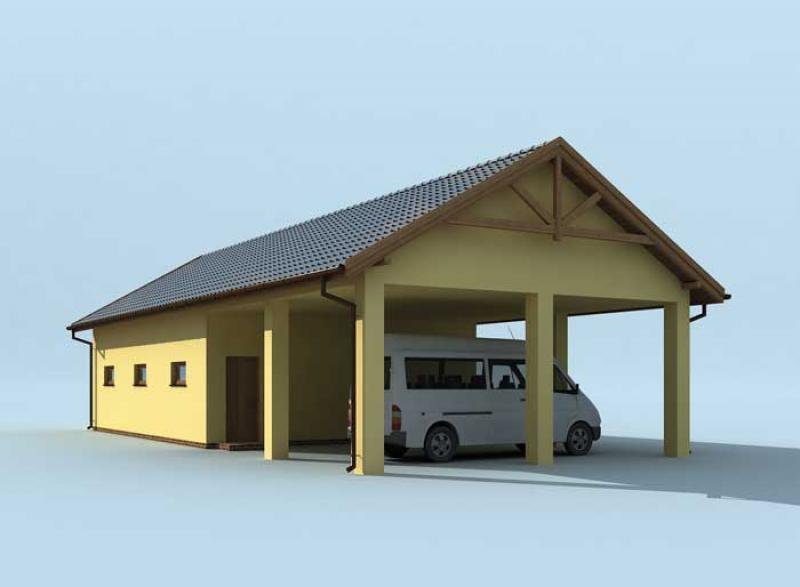 Projekt garażu dwustanowiskowego z pomieszczeniami gospodarczymi i wiatą.