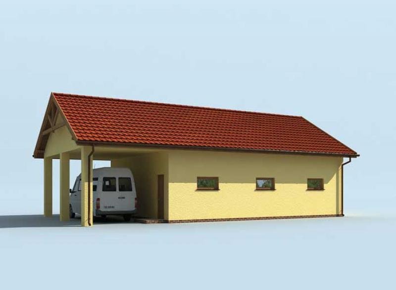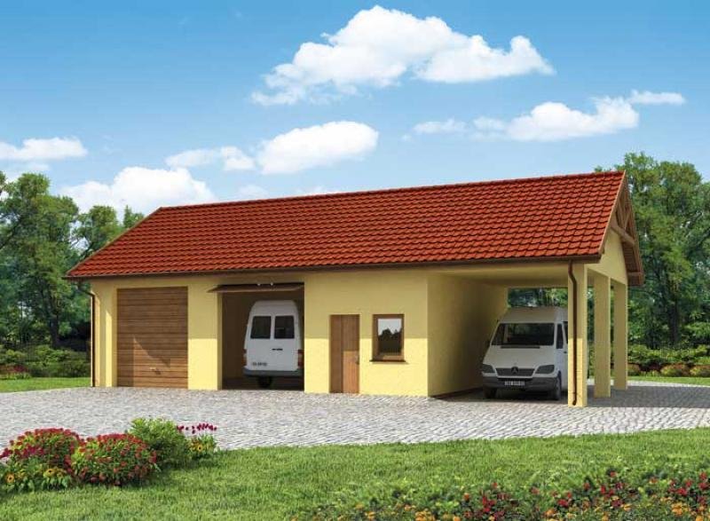 Projekt garażu dwustanowiskowego z pomieszczeniami gospodarczymi i wiatą.