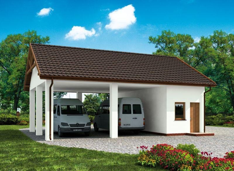 Wiata garażowa dwustanowiskowa z dwoma pomieszczeniami gospodarczymi w technologii szkieletowej, wolnostojący, parterowy.