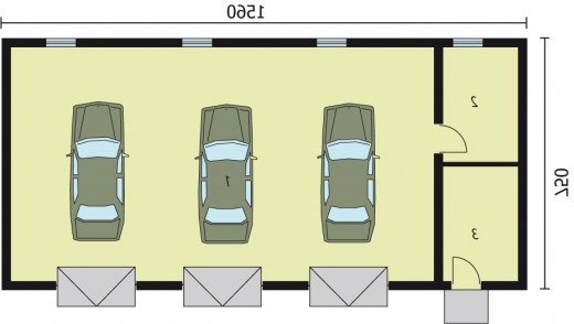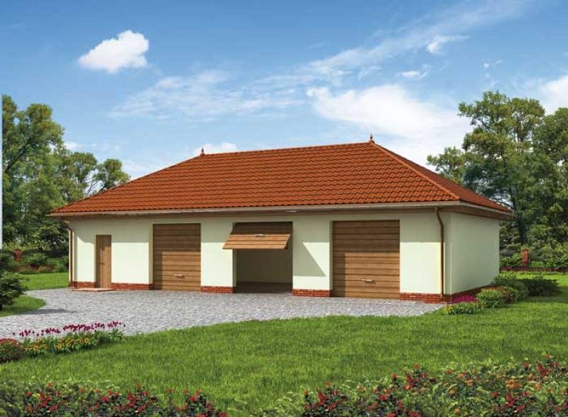 Projekt garażu trzystanowiskowego wraz z dwoma pomieszczeniami gospodarczymi.