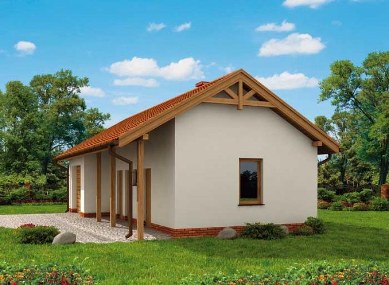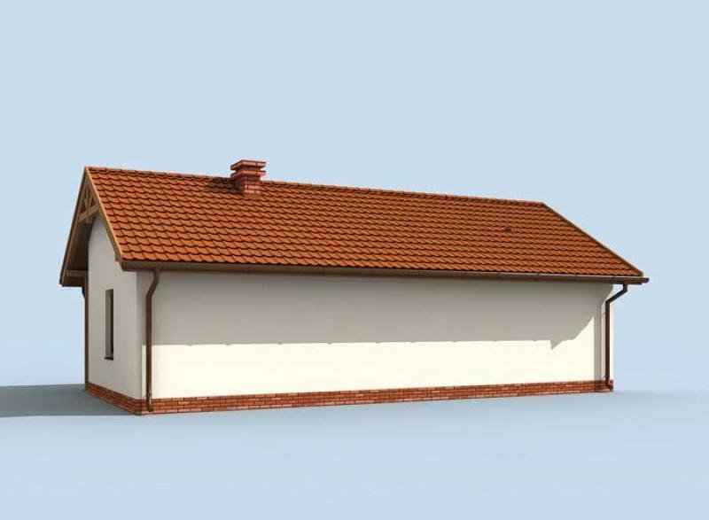 Projekt garażu jednostanowiskowego z trzema pomieszczeniami gospodarczymi oraz wiatą.