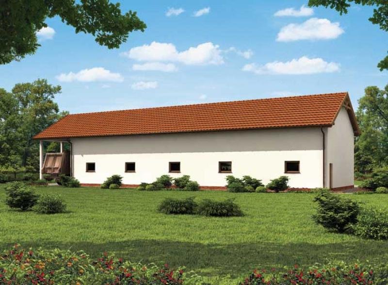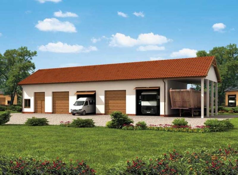 Projekt garażu czterostanowiskowego wraz z dwoma pomieszczeniami gospodarczymi oraz wiatą jednostanowiskową.