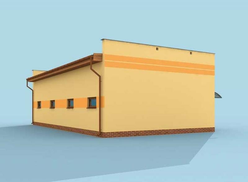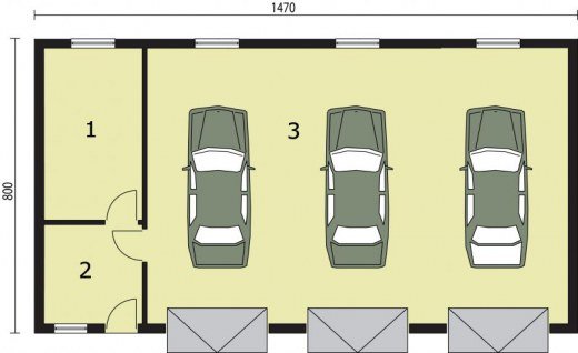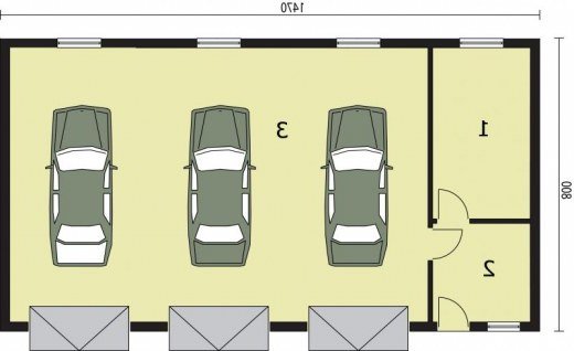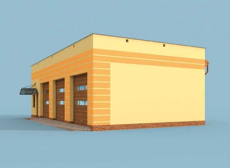 Garaż trzystanowiskowy z dwoma pomieszczeniami gospodarczymi. Może również pełnić funkcję budynku gospodarczego lub magazynowego.