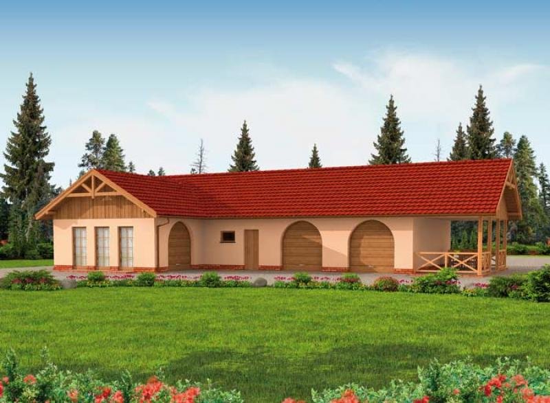 Budynek garażowy 4-stanowiskowy z pomieszczeniem gospodarczym i werandą.