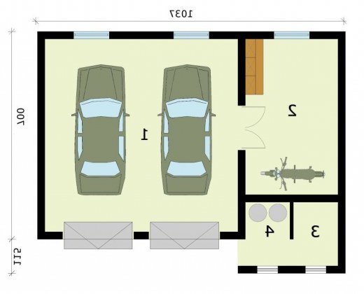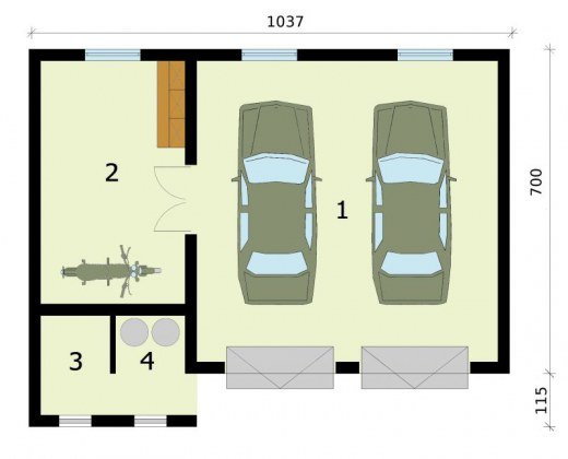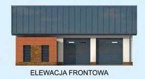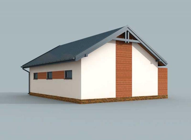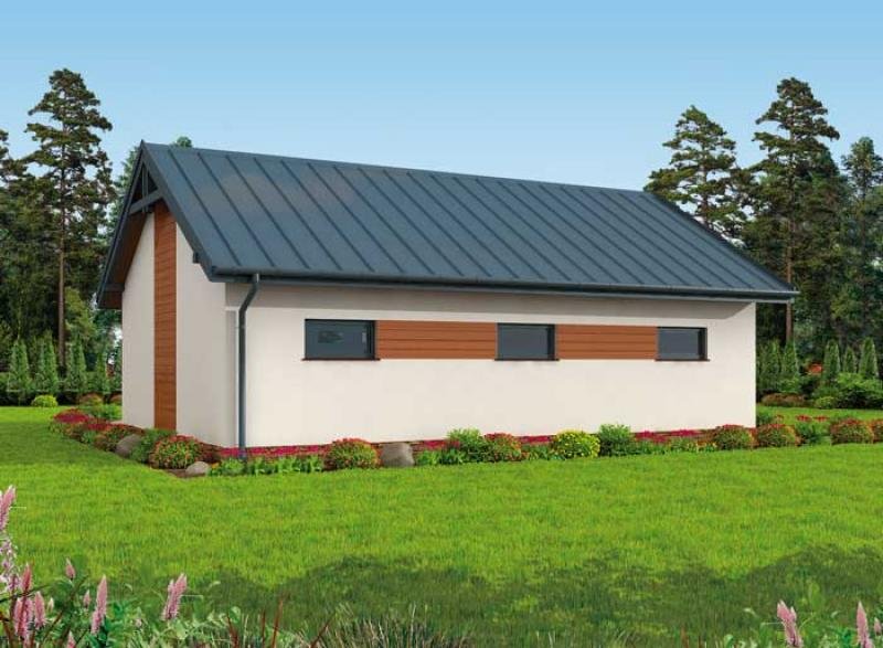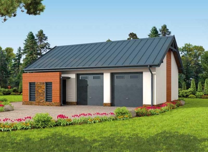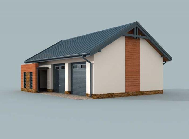 Garaż parterowy dwustanowiskowy z pomieszczeniem gospodarczym, z składem na drewno i odpady. Bramy garażowe o wymiarach otworu w murze 2400x2400. Projekt składa się z części architektonicznej, konstrukcyjnej i wewnętrznej instalacji elektrycznej. W projekcie załączone są podstawowe zestawienie stali, drewna i stolarki okienno-drzwiowej. Do projektu dołączamy bezpłatną zgodę na wprowadzenie zmian, oświadczenie projektantów o wykonaniu projektu zgodnie z obowiązującymi normami i przepisami oraz kserokopie uprawnień projektantów wraz z aktualnym wpisem do izby. W przypadku zamówienia projektu w technologii lekkiej, drewnianej konstrukcji szkieletowej, powierzchnia użytkowa budynku jest o około 7% większa.