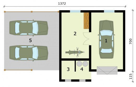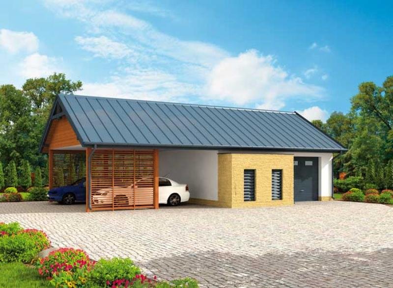 Budynek garażowy jednostanowiskowy z wiatą garażową dwustanowiskową, pomieszczeniem gospodarczym, składem na drewno i odpady. Projekt składa się z części architektonicznej, konstrukcyjnej i wewnętrznej instalacji elektrycznej. W projekcie załączone są podstawowe zestawienie stali, drewna i stolarki okienno-drzwiowej. Do projektu dołączamy bezpłatną zgodę na wprowadzenie zmian, oświadczenie projektantów o wykonaniu projektu zgodnie z obowiązującymi normami i przepisami oraz kserokopie uprawnień projektantów wraz z aktualnym wpisem do izby. W przypadku zamówienia projektu w technologii lekkiej, drewnianej konstrukcji szkieletowej, powierzchnia użytkowa budynku jest o około 7% większa.