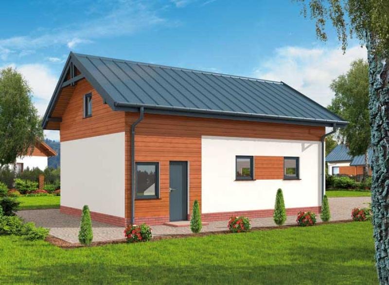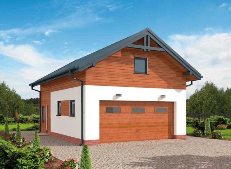 Budynek garażowy dwustanowiskowy z pomieszczeniem gospodarczym i poddasze użytkowym. Projekt składa się z części architektonicznej, konstrukcyjnej i wewnętrznej instalacji elektrycznej. W projekcie załączone są podstawowe zestawienie stali, drewna i stolarki okienno-drzwiowej. Do projektu dołączona jest bezpłatna zgoda na wprowadzenie zmian, oświadczenie projektantów o wykonaniu projektu zgodnie z obowiązującymi normami i przepisami oraz kserokopie uprawnień projektantów wraz z aktualnym wpisem do izby. W przypadku zamówienia projektu w technologii lekkiej, drewnianej konstrukcji szkieletowej, powierzchnia użytkowa budynku jest o około 7% większa.