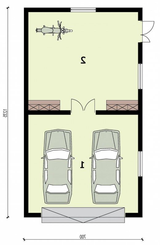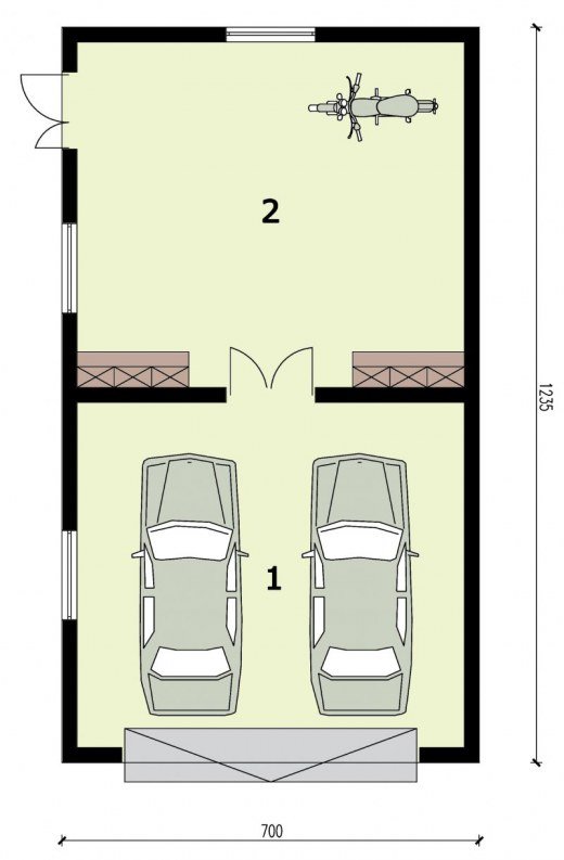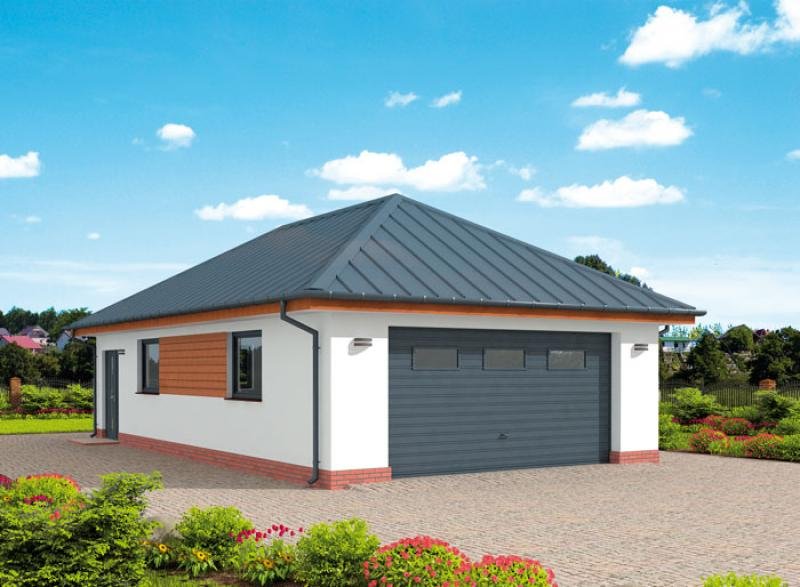 Garaż dwustanowiskowy, wolnostojący, parterowy z pom. gospodarczym. Wymiary bramy garażowej 5000x2400. Projekt składa się z części architektonicznej, konstrukcyjnej i wewnętrznej instalacji elektrycznej. W projekcie załączone są podstawowe zestawienie stali, drewna i stolarki okienno-drzwiowej. Do projektu dołączone są: bezpłatna zgoda na wprowadzenie zmian, oświadczenie projektantów o wykonaniu projektu zgodnie z obowiązującymi normami i przepisami oraz kserokopie uprawnień projektantów wraz z aktualnym wpisem do izby. W przypadku zamówienia projektu w technologii lekkiej, drewnianej konstrukcji szkieletowej, powierzchnia użytkowa budynku jest o około 7% większa.