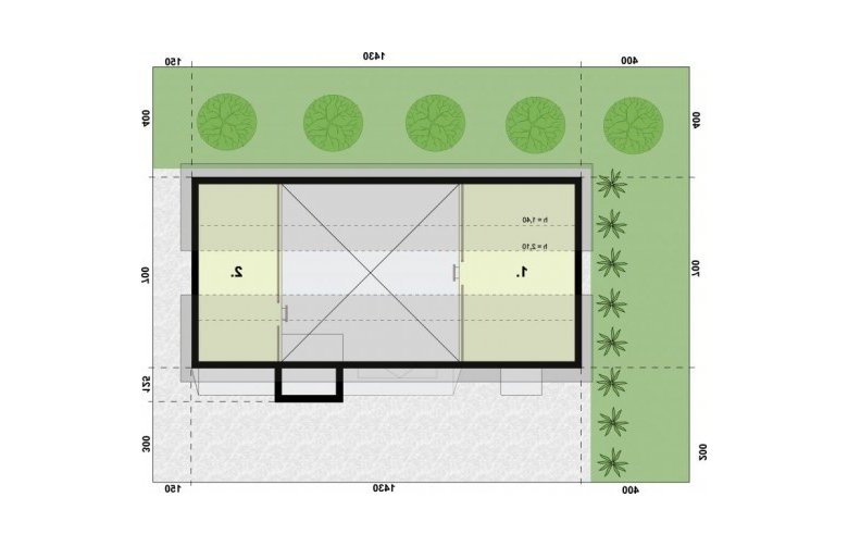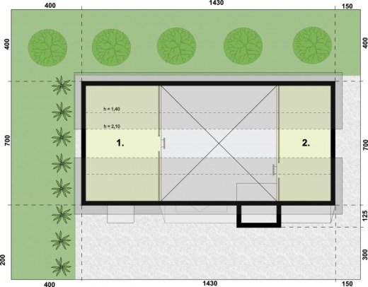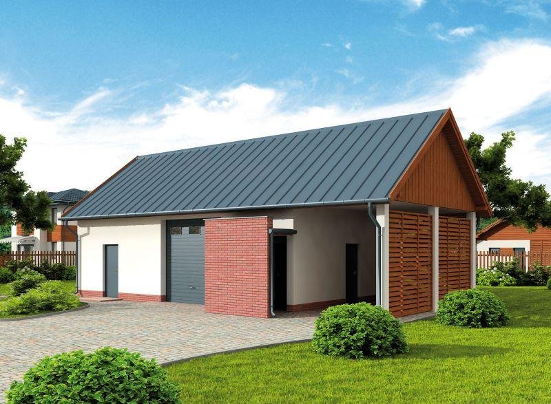 Garaż jednostanowiskowy z pomieszczeniem gospodarczym, wiatą oraz poddaszem nie użytkowym.