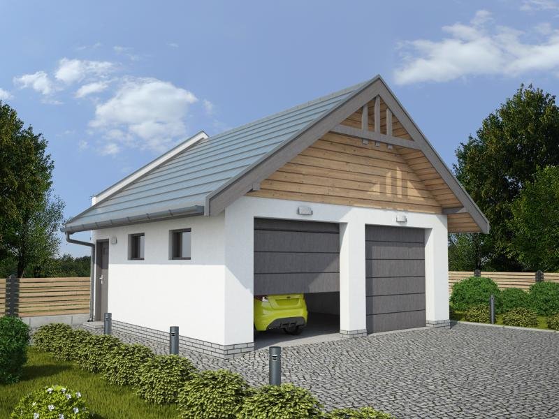 Garaż dwustanowiskowy z dachem dwuspadowym, przystosowany do postawienia w granicy działki
