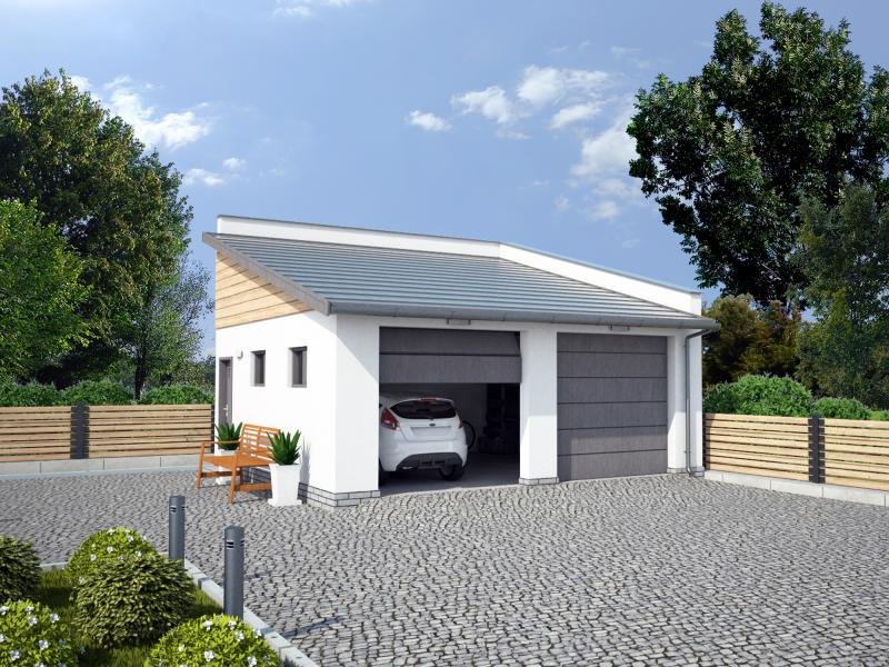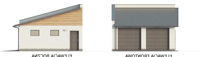 Garaż dwustanowiskowy z dachem jednospadowym, przystosowany do postawienia w granicy i narożniku działki