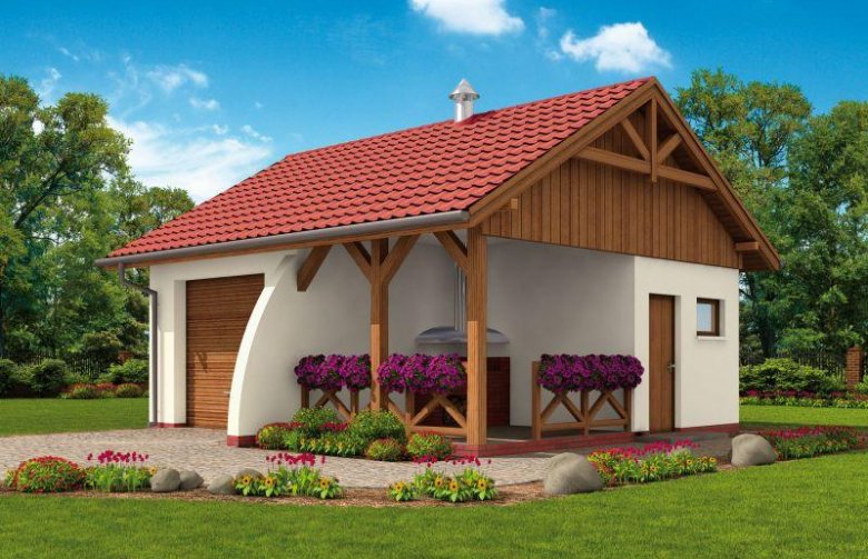 Garaż jednostanowiskowy w technologii szkieletowej, wolnostojący. Brama garażowa o wymiarach 2400x2400. Garaż posiada dodatkowe pomieszczenie gospodarcze i altanę.