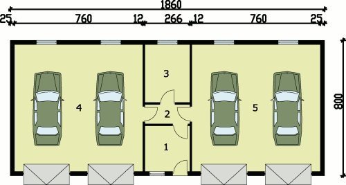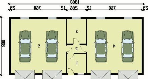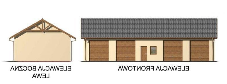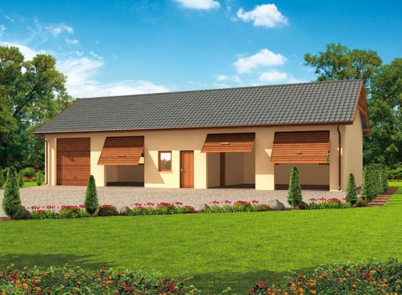 Projekt garażu czterostanowiskowego z dwoma pomieszczeniami gospodarczymi.
