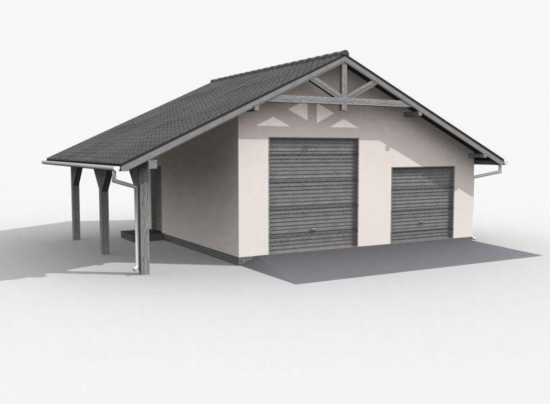 Garaż dwustanowiskowy z wiatą garażową jednostanowiskową w technologii szkieletowej, wolnostojący, parterowy.