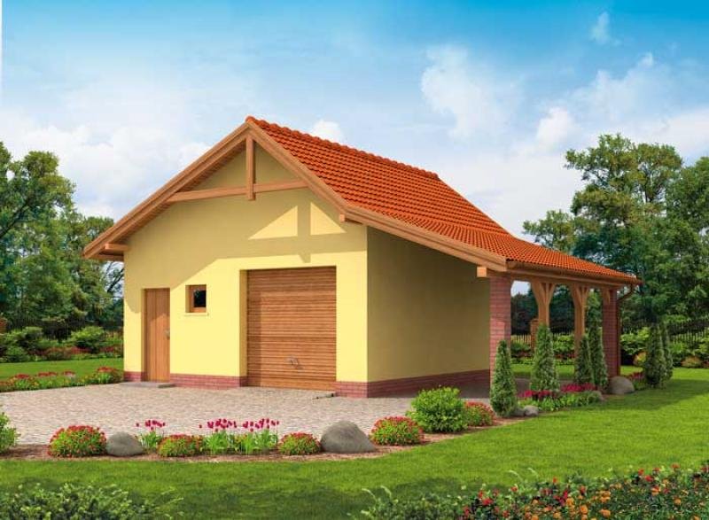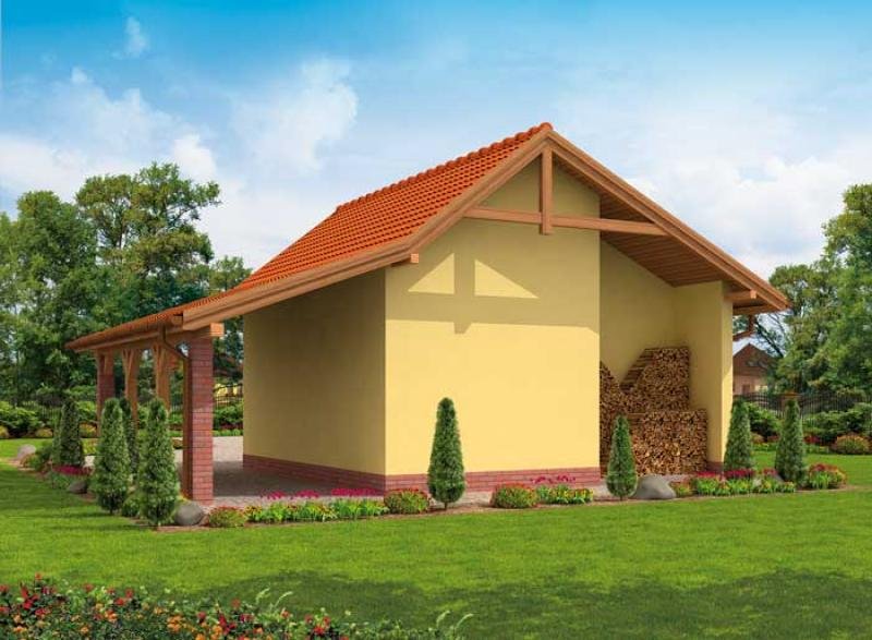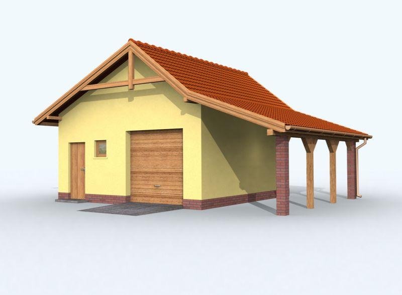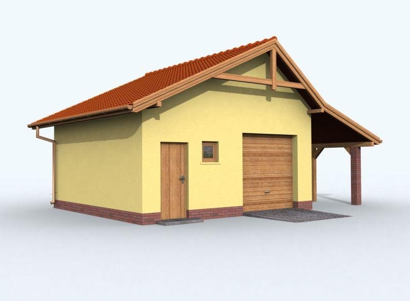 Garaż jednostanowiskowy z pomieszczeniem gospodarczym, składem na drewno i wiata garażową. Bramy garażowe o wymiarach otworu w murze 2400x2400. Projekt składa się z części architektonicznej, konstrukcyjnej i wewnętrznej instalacji elektrycznej. W projekcie załączone są podstawowe zestawienie stali, drewna i stolarki okienno-drzwiowej. Do projektu dołączamy bezpłatną zgodę na wprowadzenie zmian, oświadczenie projektantów o wykonaniu projektu zgodnie z obowiązującymi normami i przepisami oraz kserokopie uprawnień projektantów wraz z aktualnym wpisem do izby. W przypadku zamówienia projektu w technologii lekkiej, drewnianej konstrukcji szkieletowej, powierzchnia użytkowa budynku jest o około 7% większa.