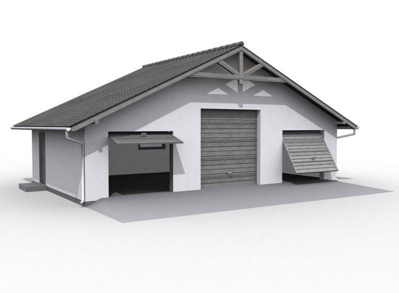 Garaż trzystanowiskowy, wolnostojący, parterowy. Bramy garażowe o wymiarach 2800x300 i 2400x2250.